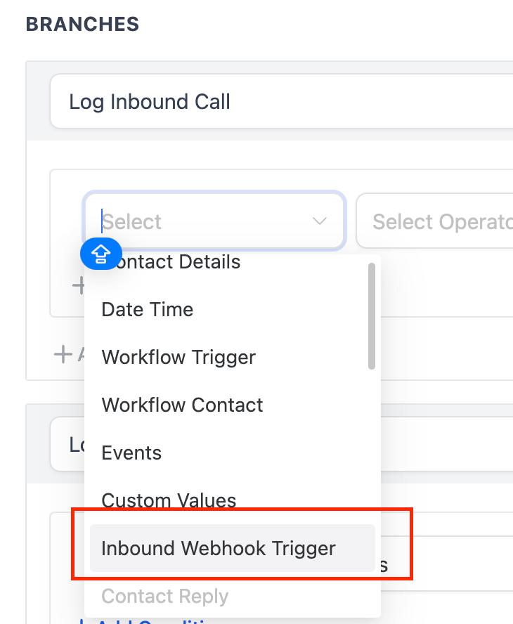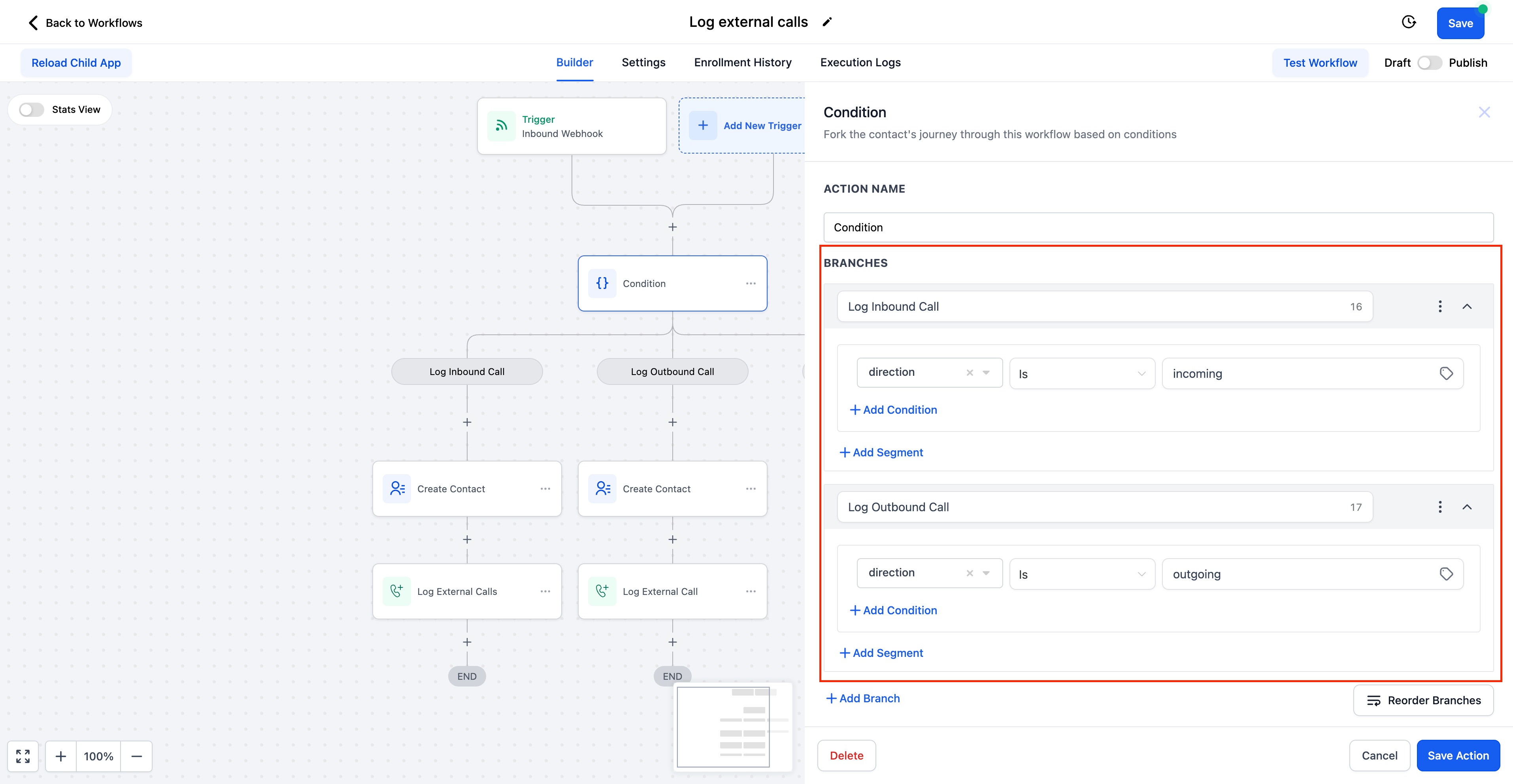 Once the trigger is configured, add the If/Else brach with direction field to separate inbound and outbound flows.