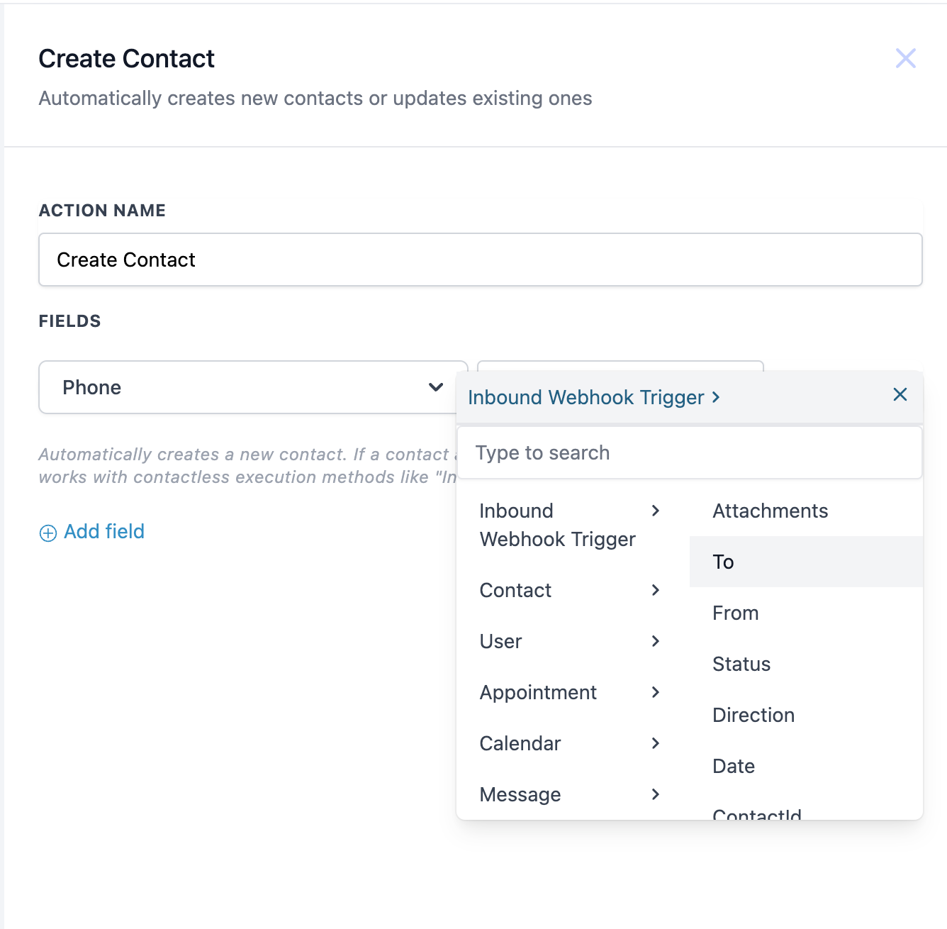 After creating two branches for Inbound calls and Outbound calls, Add "Create Contact Action. This will identify the contact on which the call should be posted using the phone numbers that you pass in the webhook.