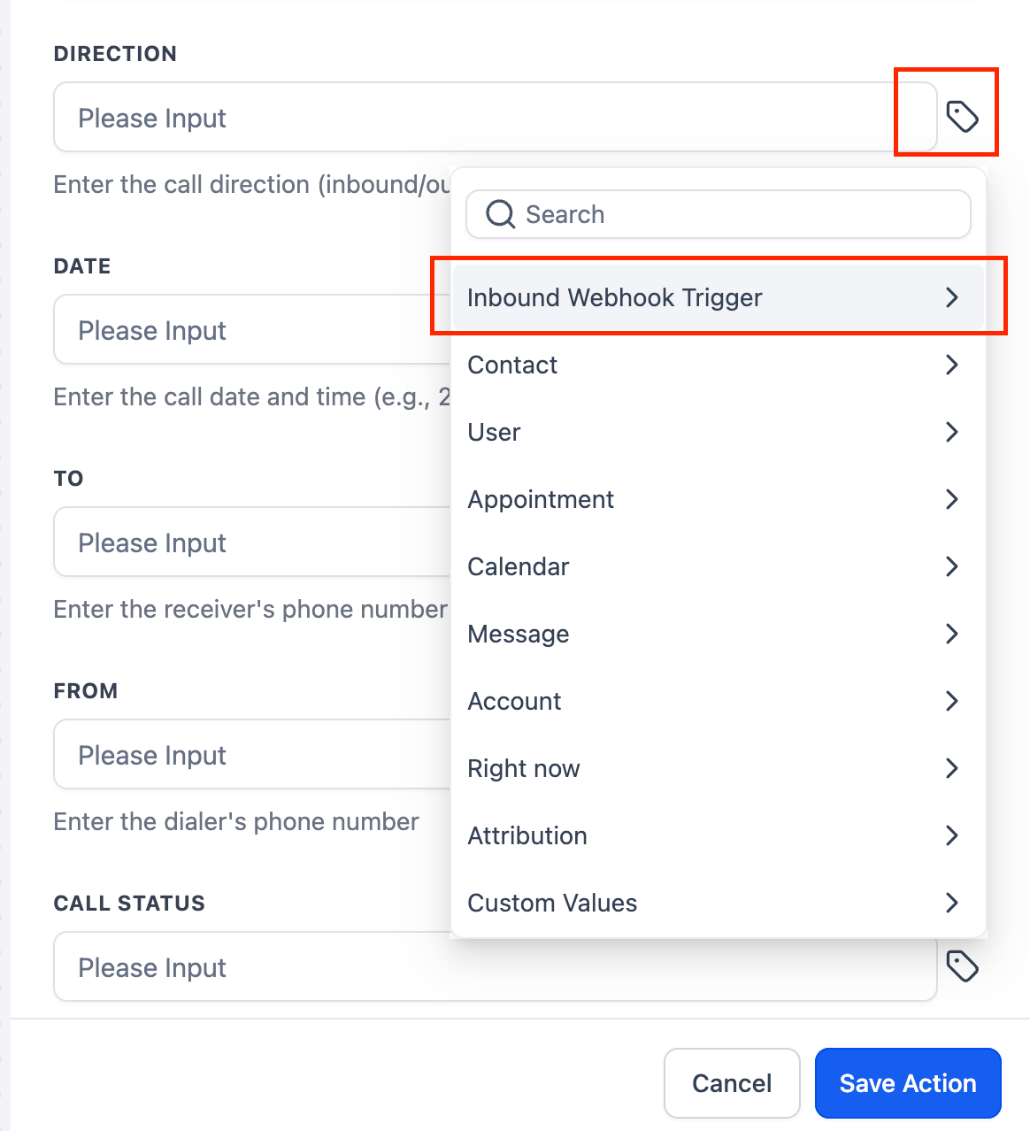 For each field, Direction, Date, To, From, Call Status and Attachment, update the related values by clicking on custom values icon > Inbound Webhook Trigger.