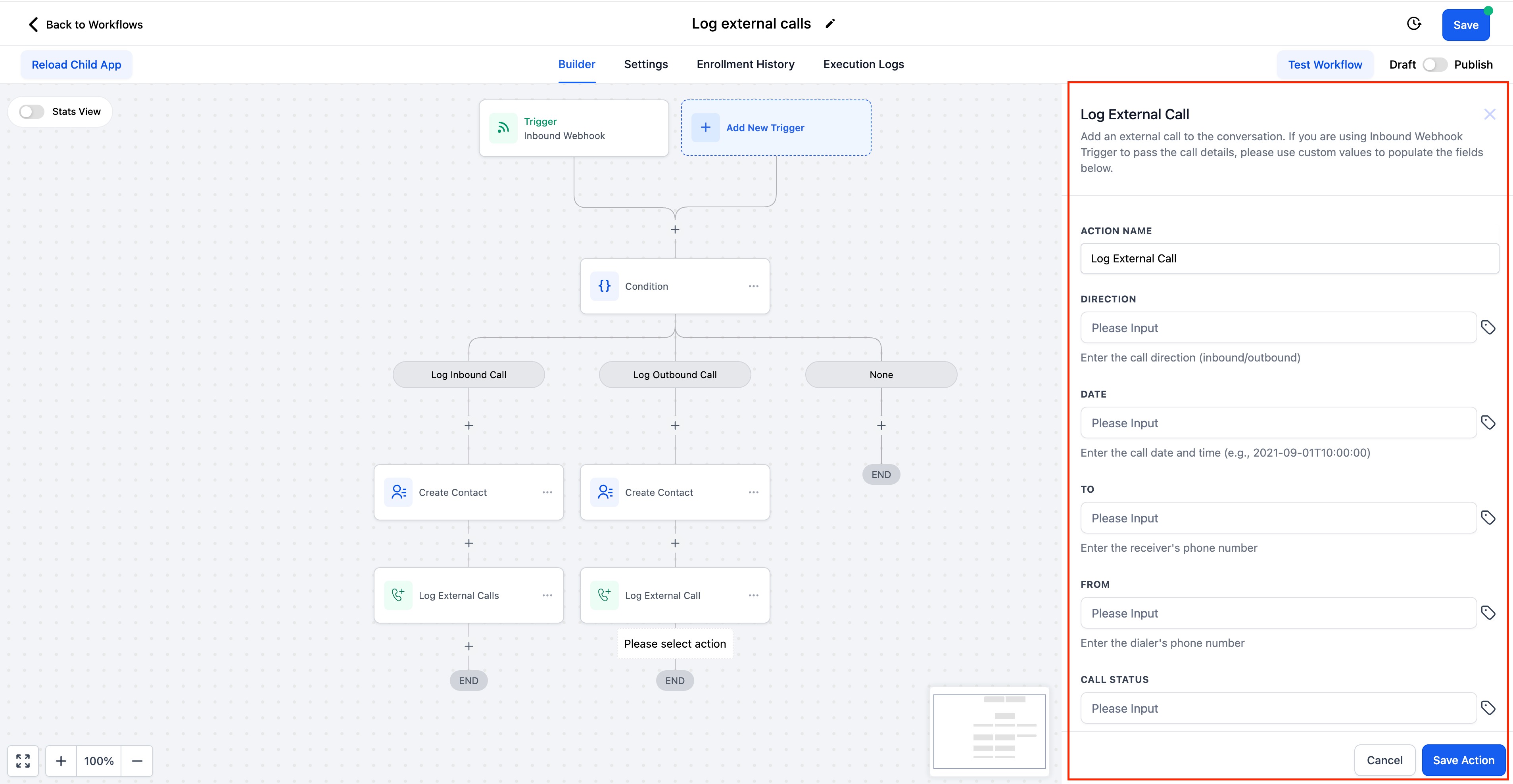 This document explains how to use the workflow action - Log External Call, to log calls from third-party calling tools into the CRM.