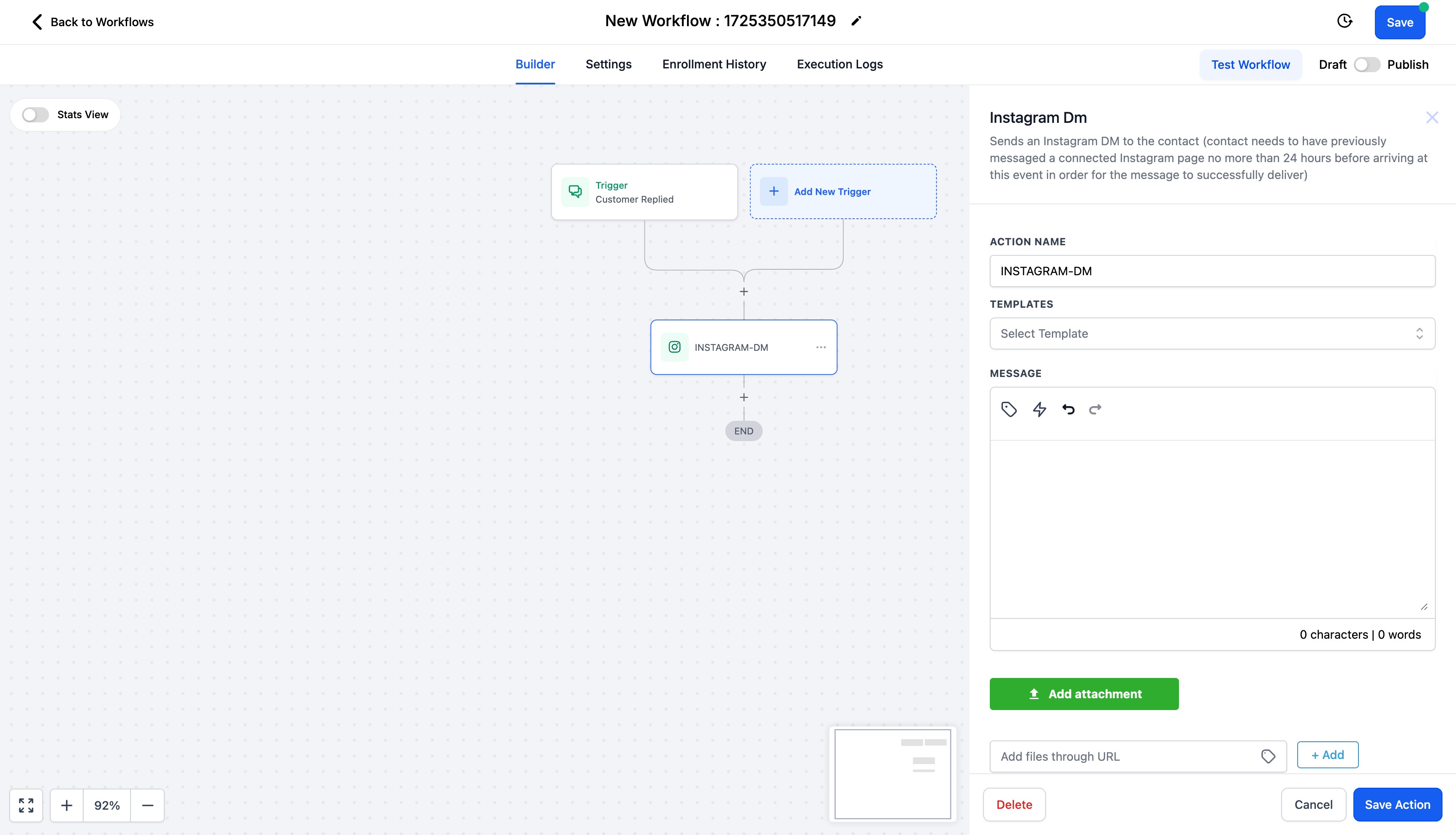 The workflow action Instagram DM allows you to send an Instagram DM to the contact (contact needs to have previously messaged a connected Instagram page no more than 24 hours before arriving at this event in order for the message to successfully deliver)