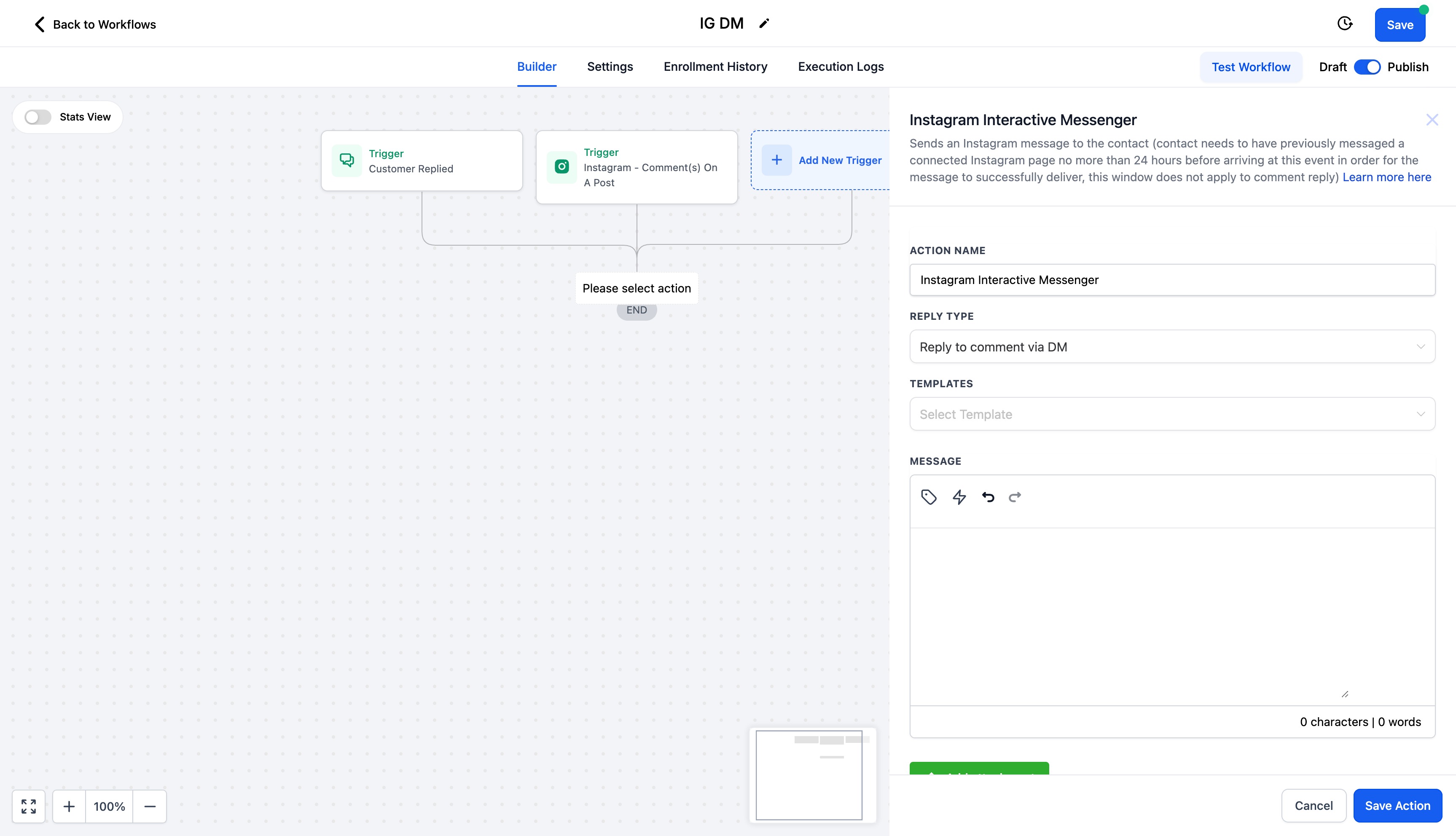 Use this action with the Trigger - "Customer Replied" and reply channel is "Instagram DM".