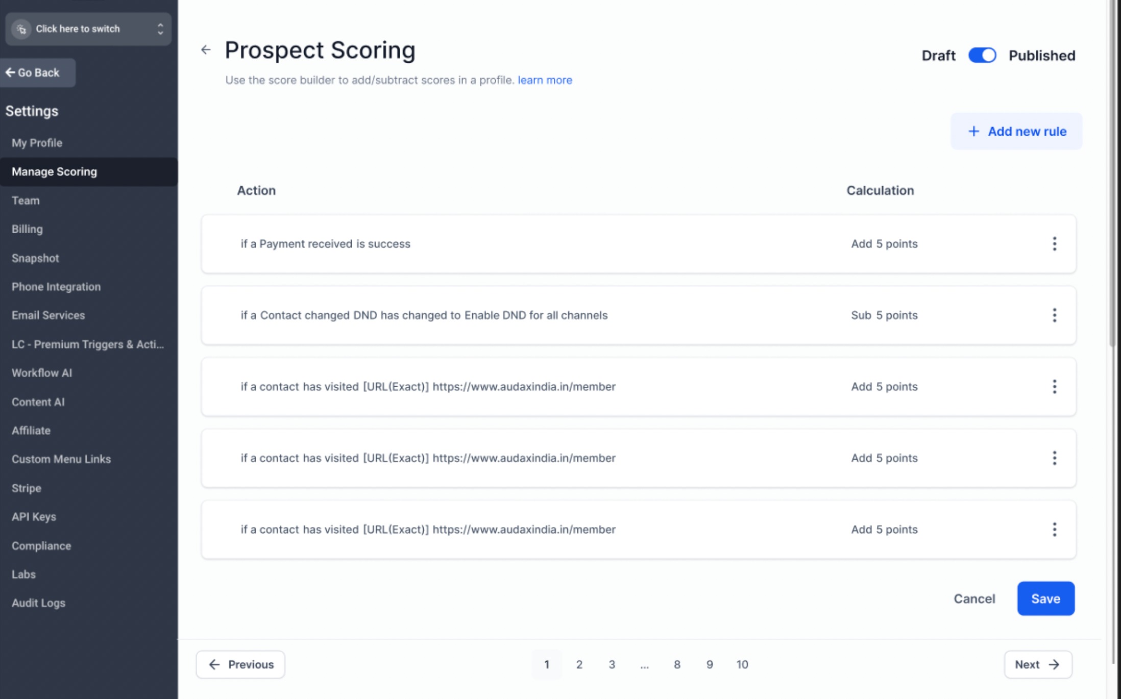 Draft/ Publish : By default the score profile stays in draft state. Once the profile is published, the score will be reflected to all the contacts