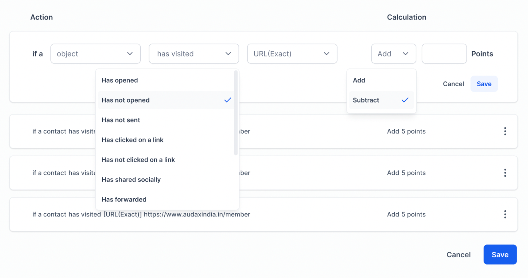 - Add or Subtract Points: You have full control over the scoring rules. Using the score builder, you can create rules to add or subtract points based on specific criteria, such as engagement, behavior, or any other relevant factors.