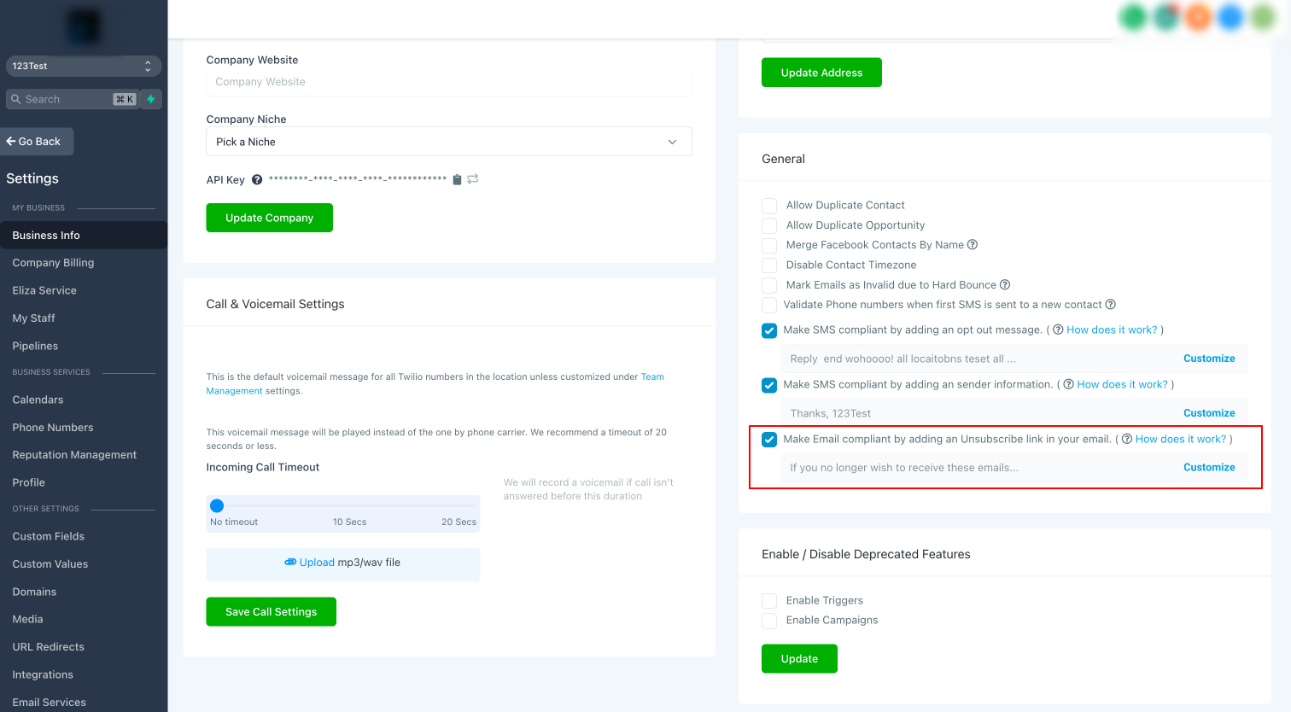 Navigate to Settings -> Business info. Under the "General section," you can find the settings to control unsubscribing. Click Customize.