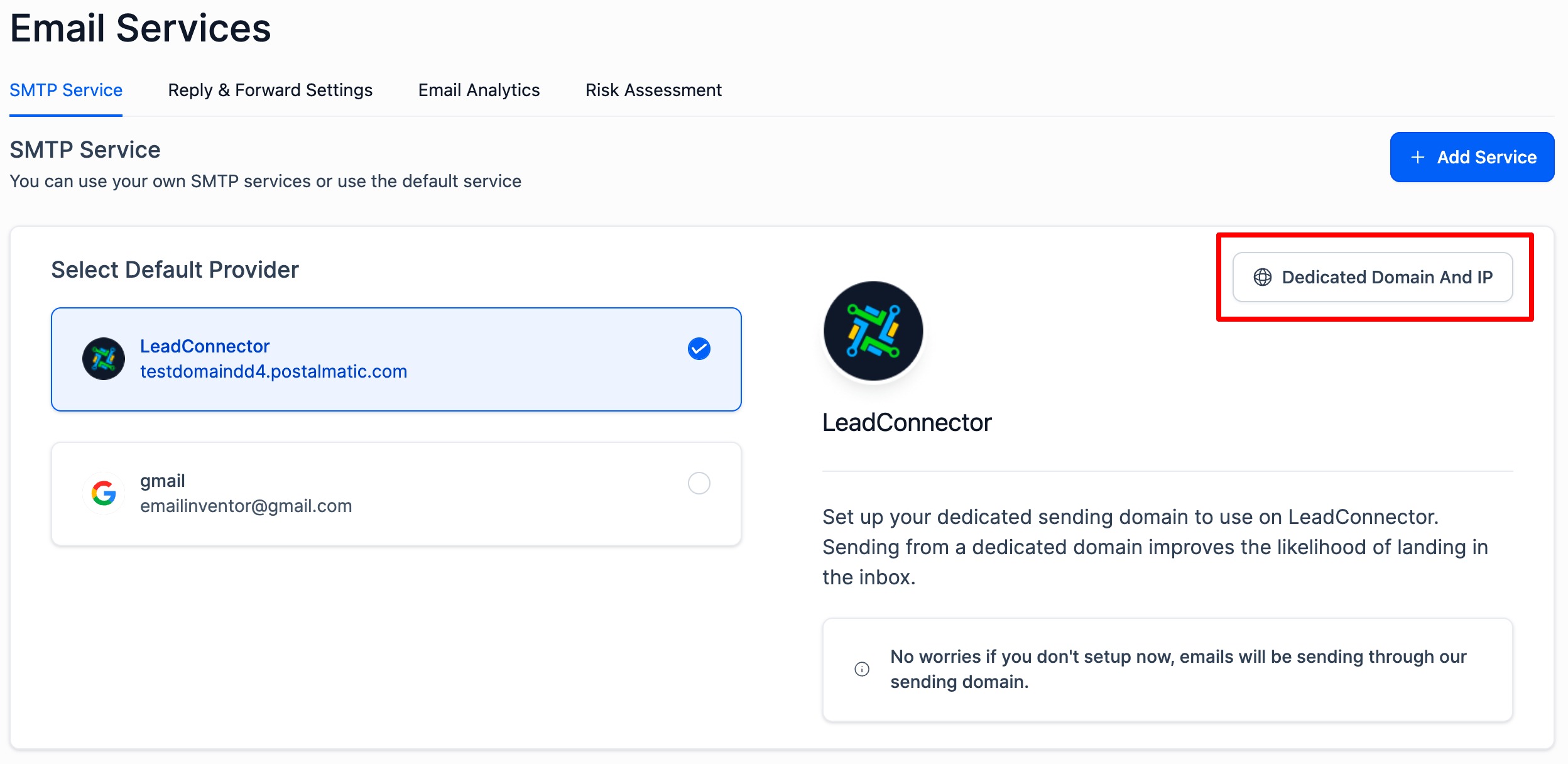 - In SMTP service tab, Click on the Dedicated Domain And IP in LeadConnector section.