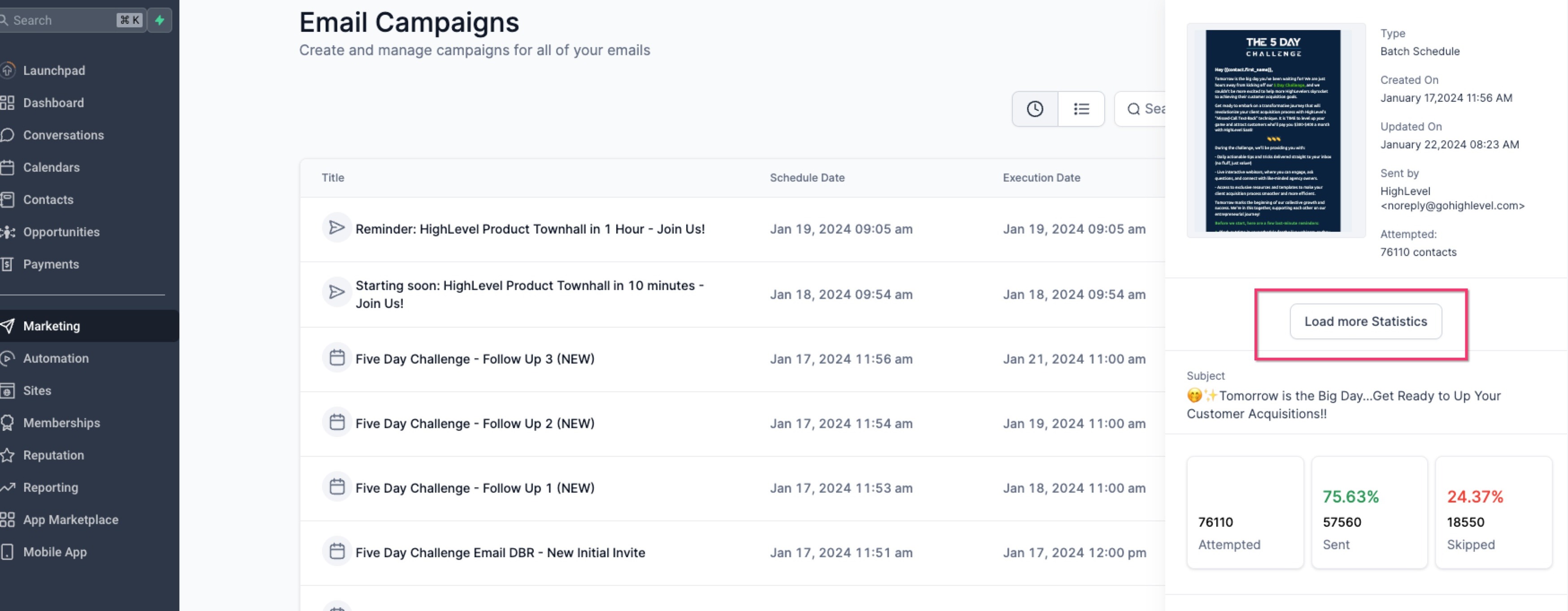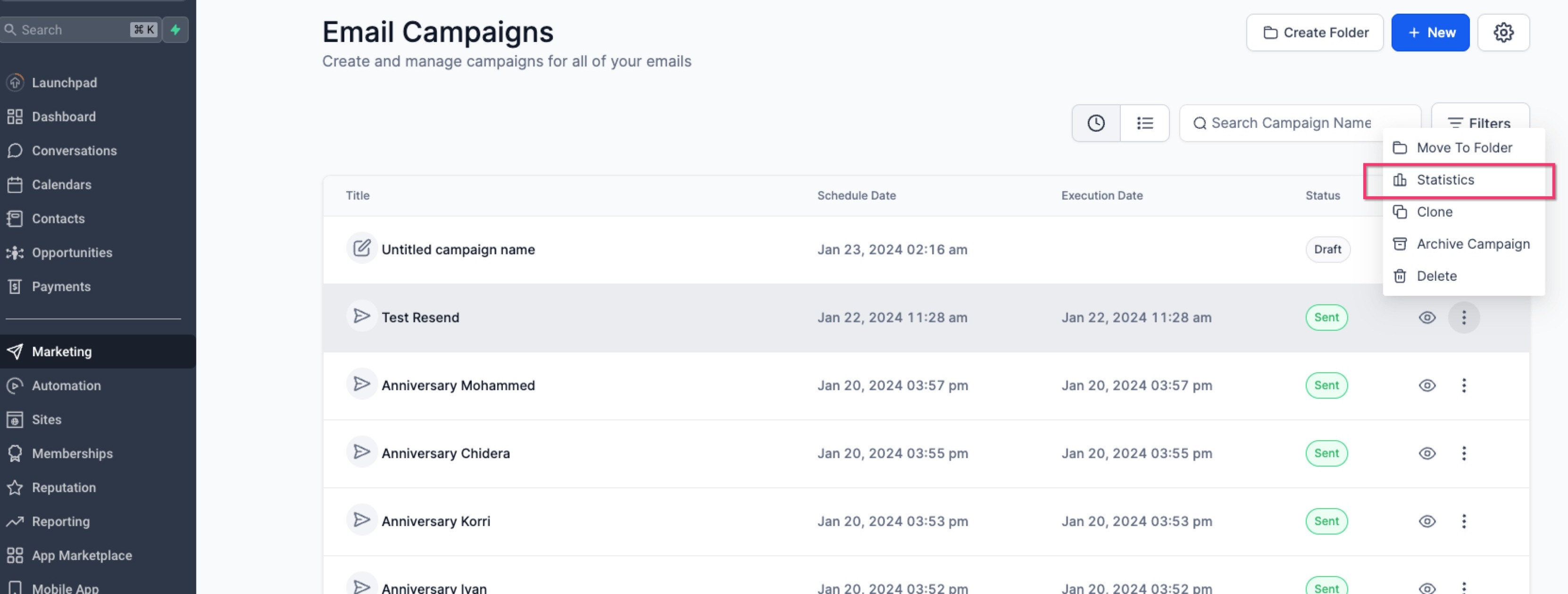 - Click the "three dots" icon to the right of the campaign and select "Statistics."