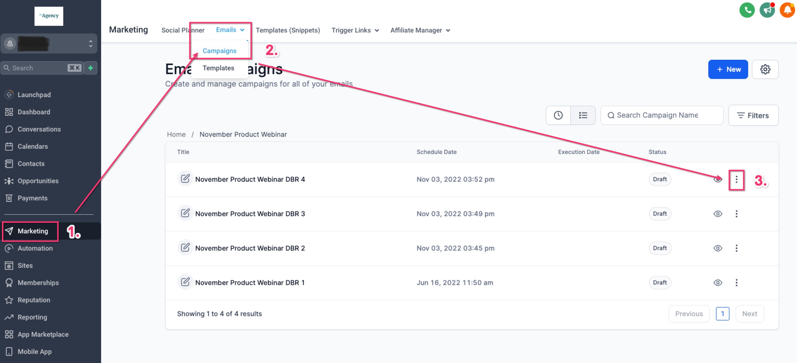- Go to "Marketing" > "Emails" > "Campaigns" and find your email campaign.