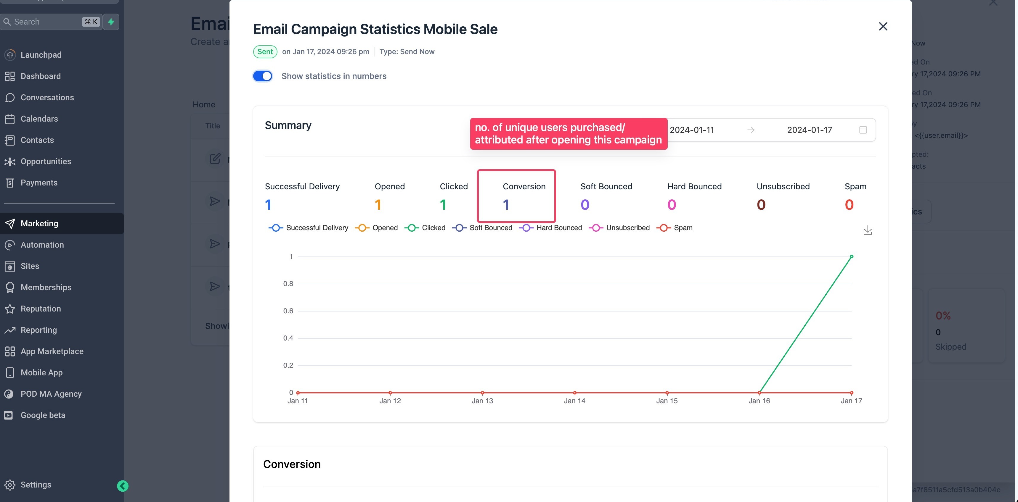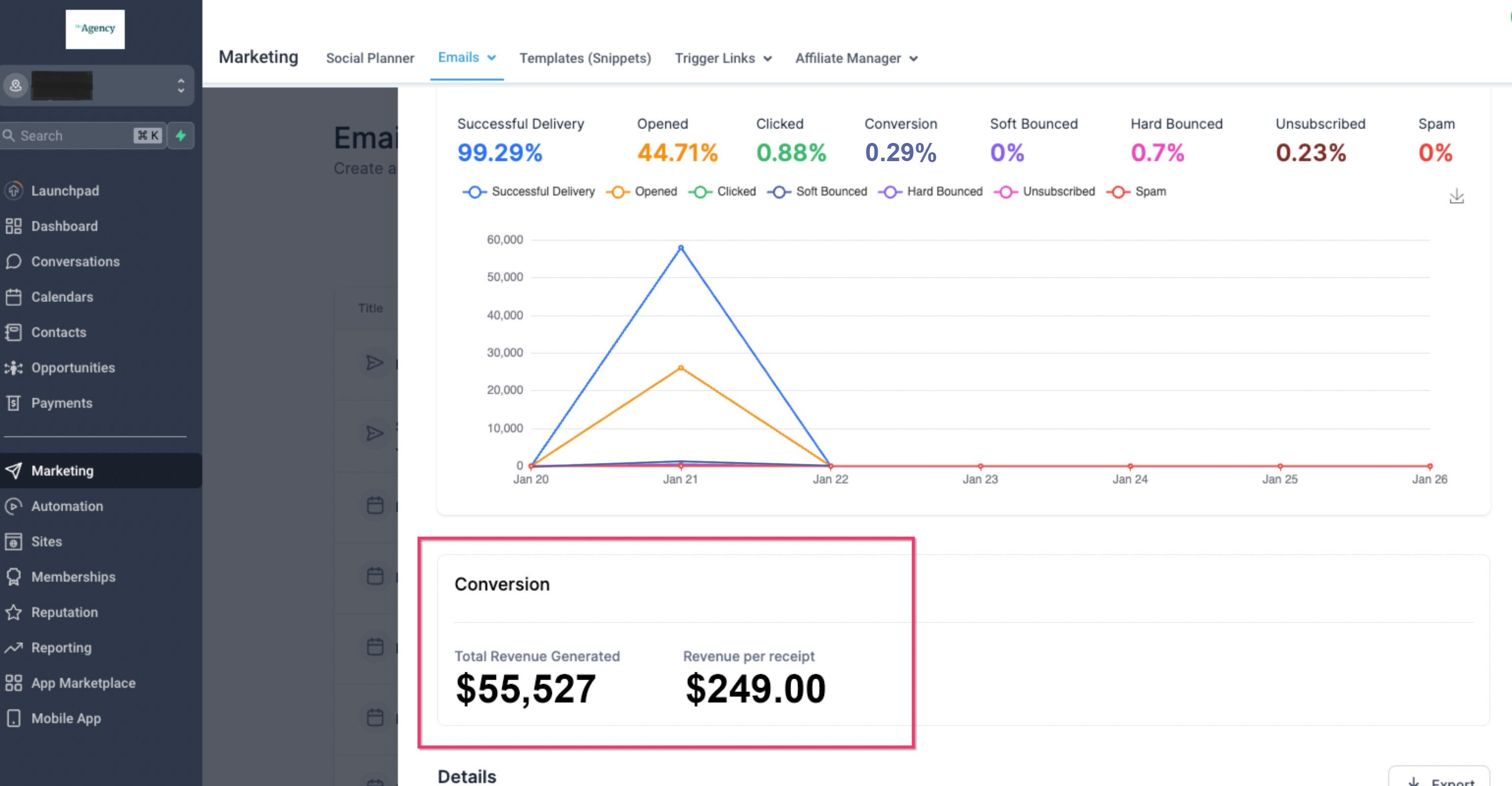 - In the "Conversion" section, you'll see an overview of "Total Revenue Generated" as well as "Revenue per receipt" generated from the email campaign.