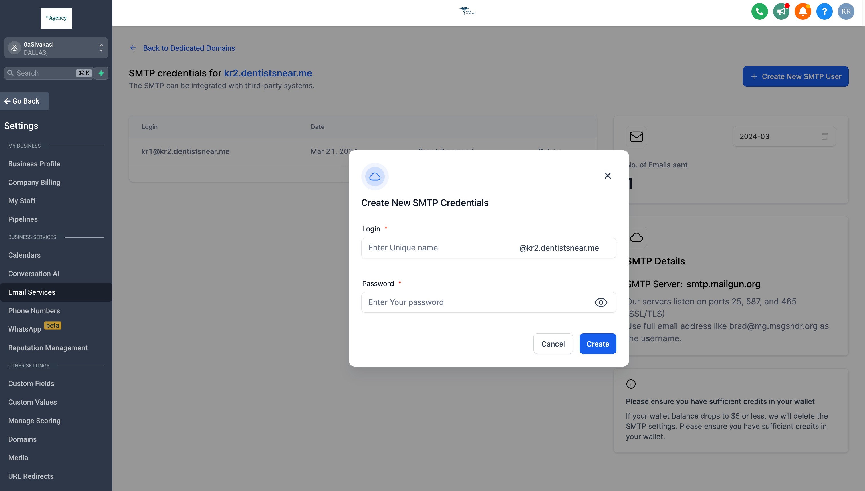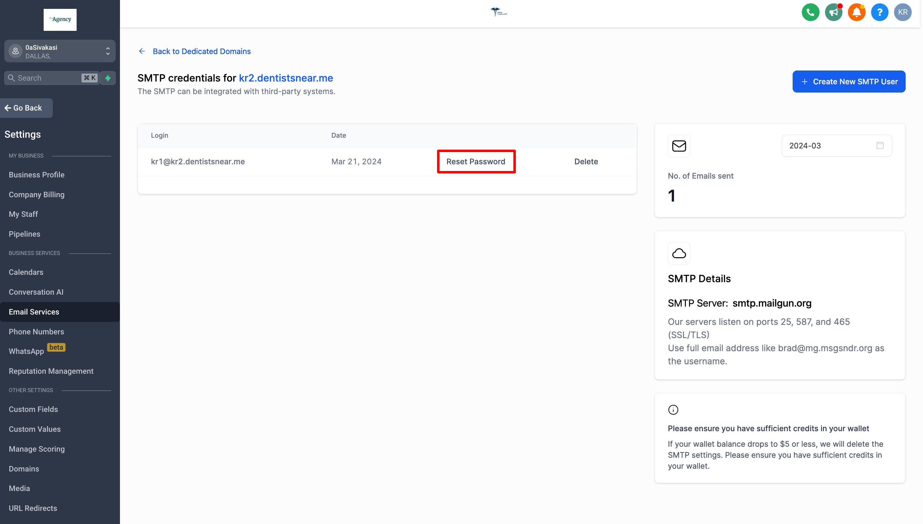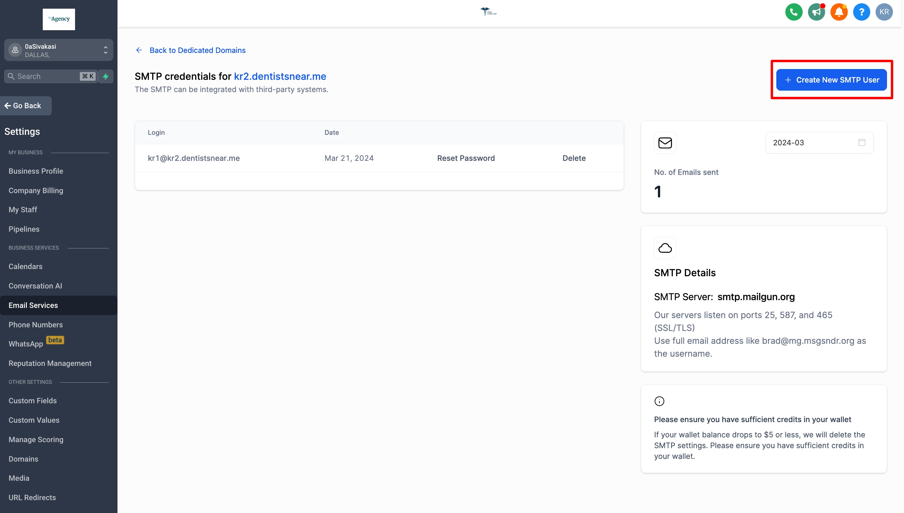 SMTP credentials can be created in sub-accounts level(not the agency-assigned domain) not at the agency level.