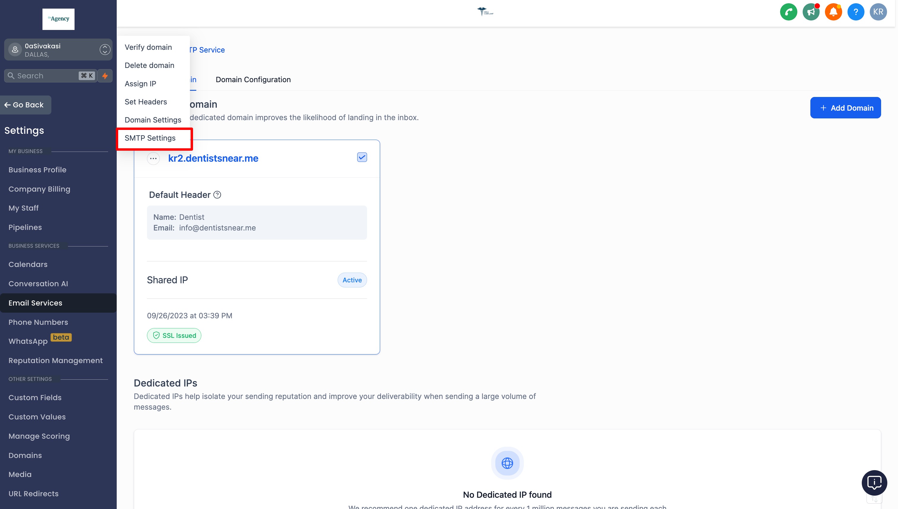 - Navigate to Sub-account Settings - Email Service -> SMTP Service -> Dedicated Domain and IP -> SMTP Settings under dedicated domain.