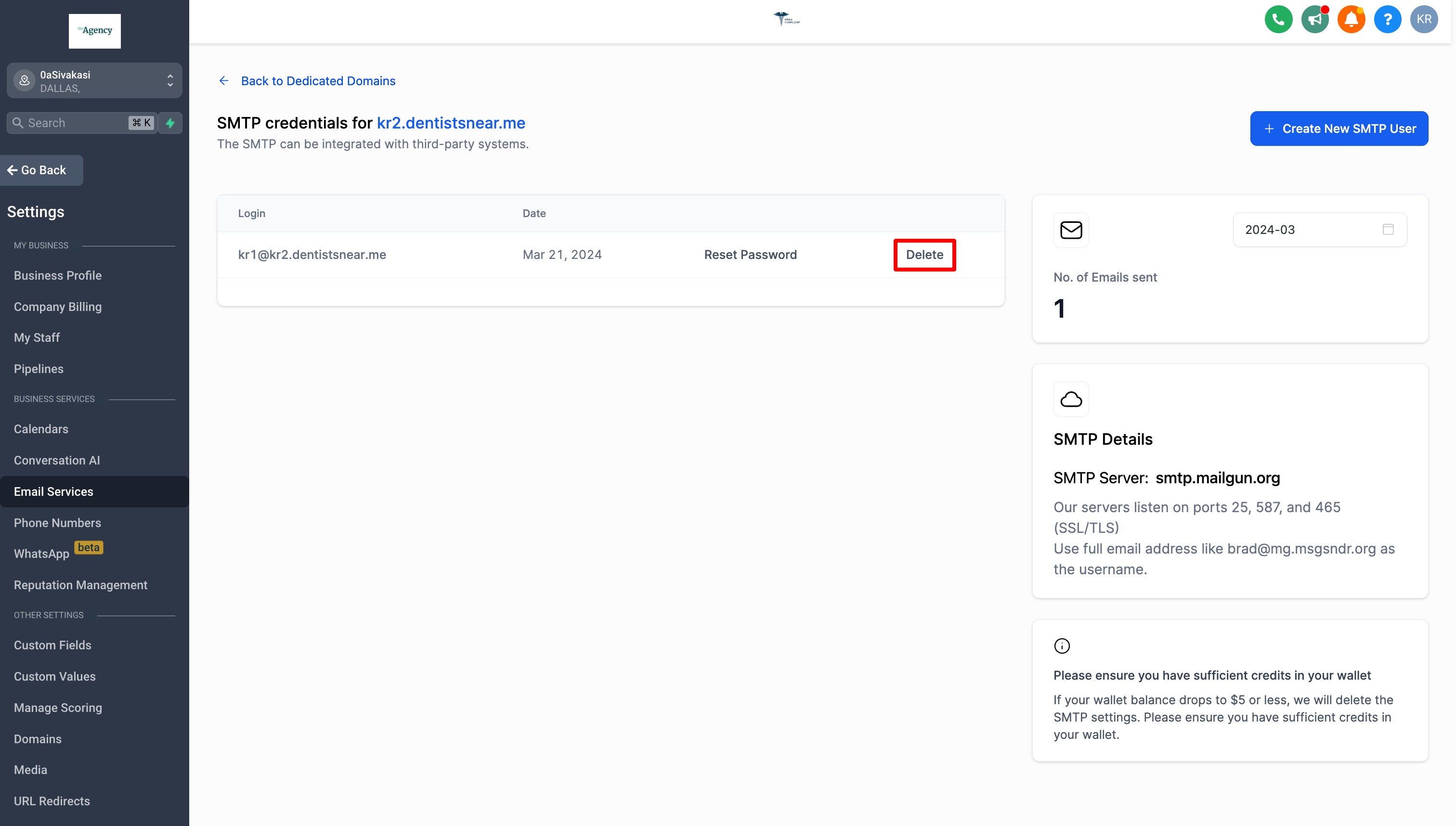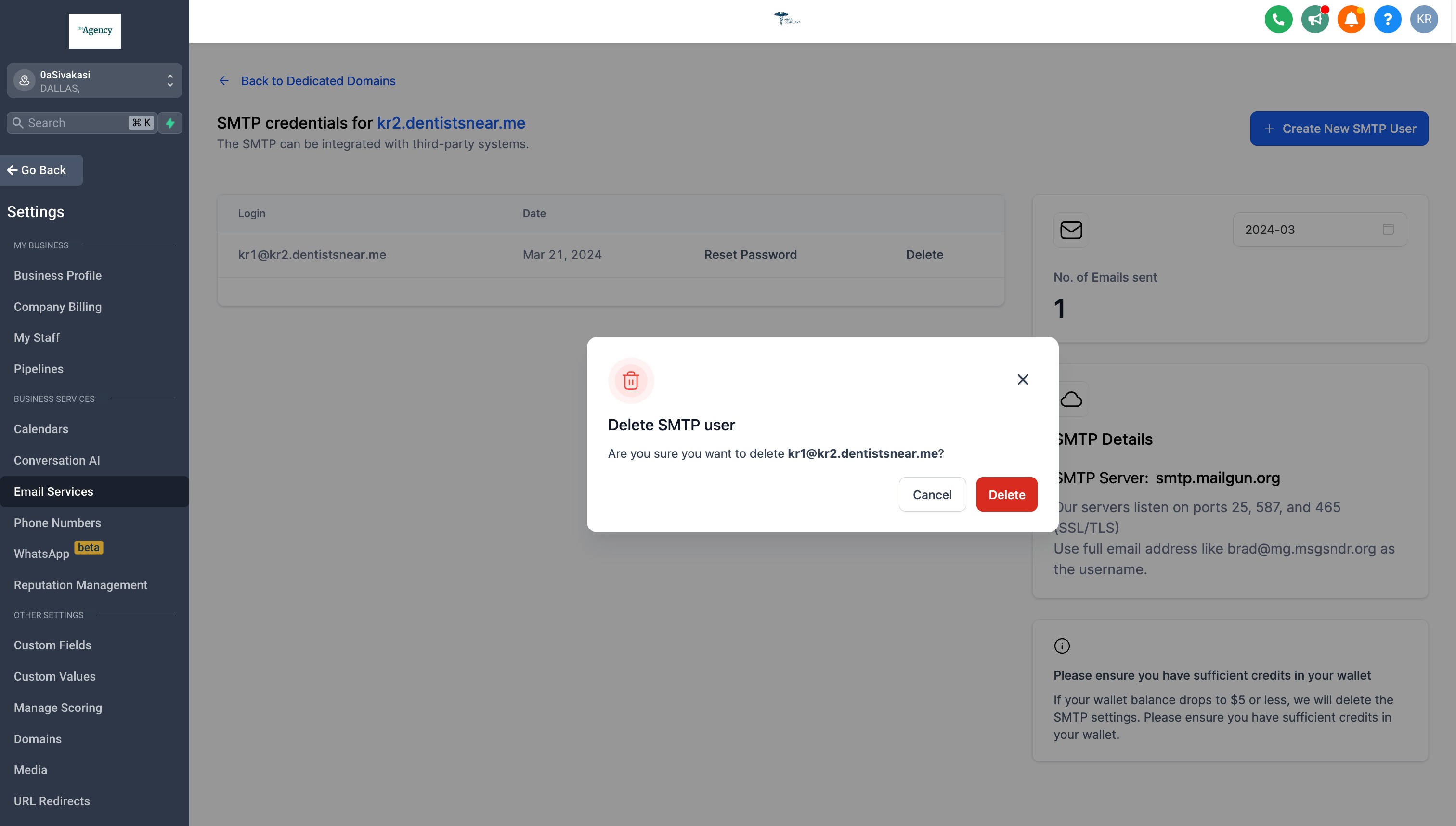 To Delete the SMTP credential, kindly click on the "Delete" button located in the pop-up modal.
