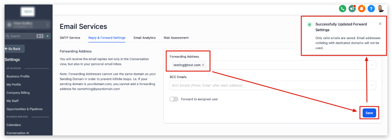 IMPORTANT: Forwarding address and BCC Emails ONLY work when using Mailgun and LC Email. We don't support other smtp providers.