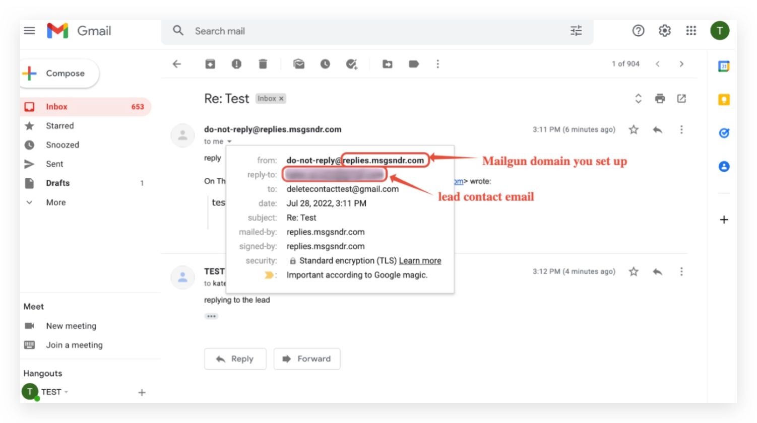 If you mask the sender email like testing@gmail.com, the reply-to address will show as testing@replies.subdomain.com, which is the Mailgun subdomain we set up for the location in Agency Settings-> Mailgun.