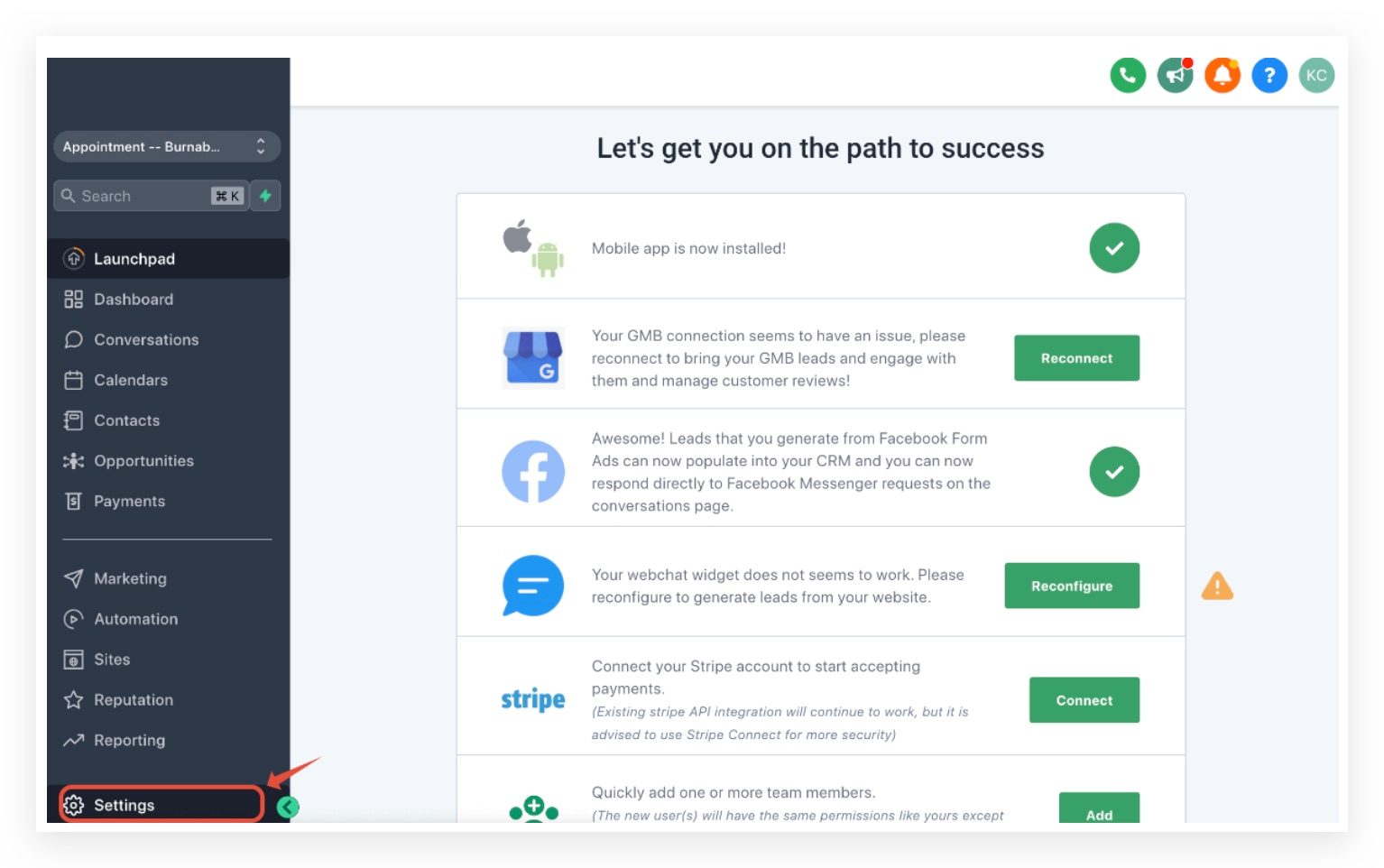 Once you are in the location, click on Settings -> Email Services