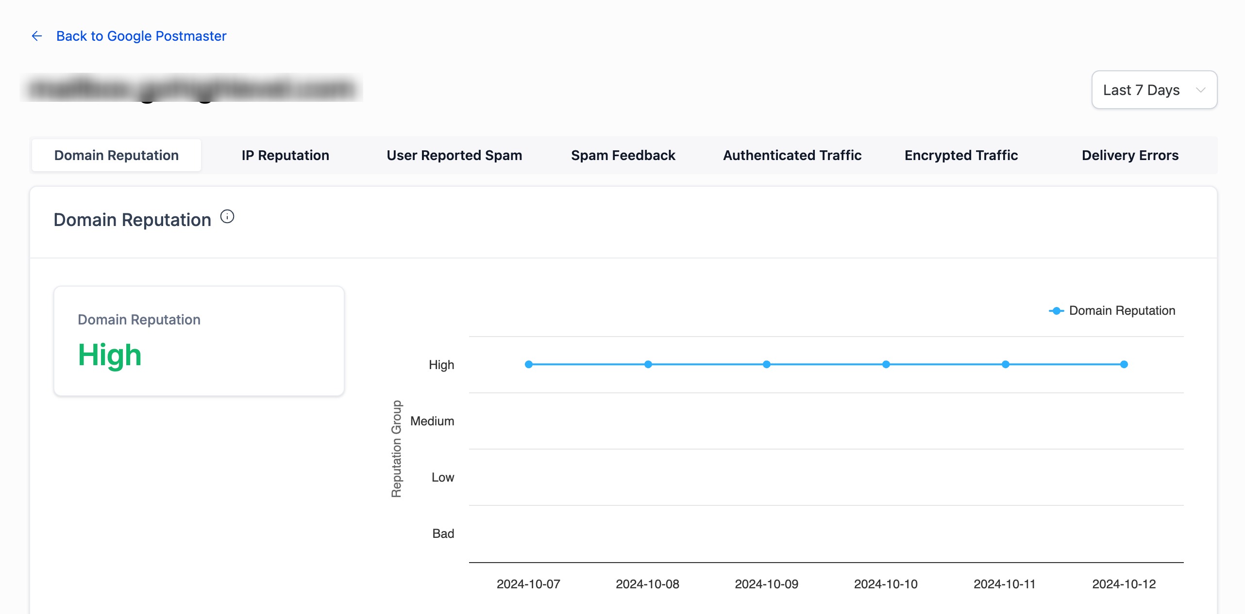 - Domain Reputation Dashboard: Shows the reputation of your domain based on Google’s perception of your sending practices.