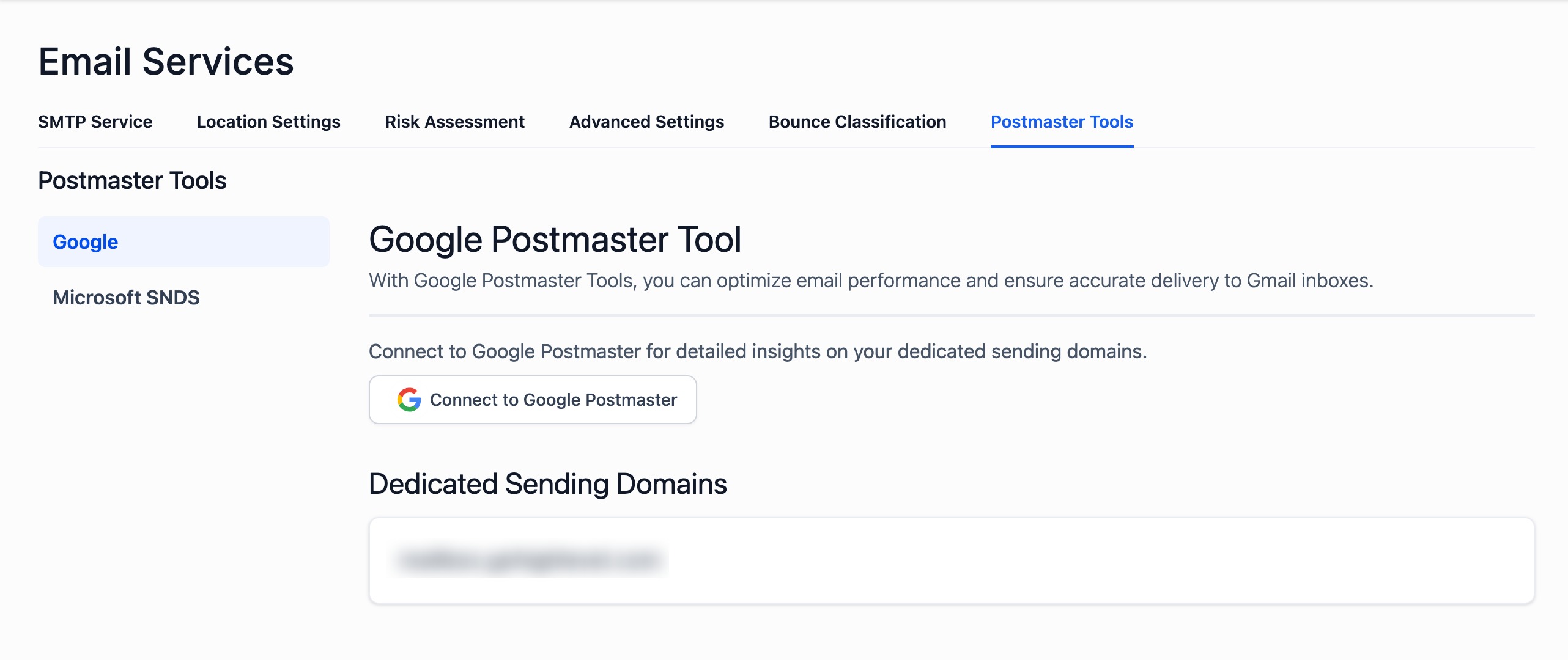 Once connected, your verified dedicated sending domains will start displaying metrics pulled from Google Postmaster.