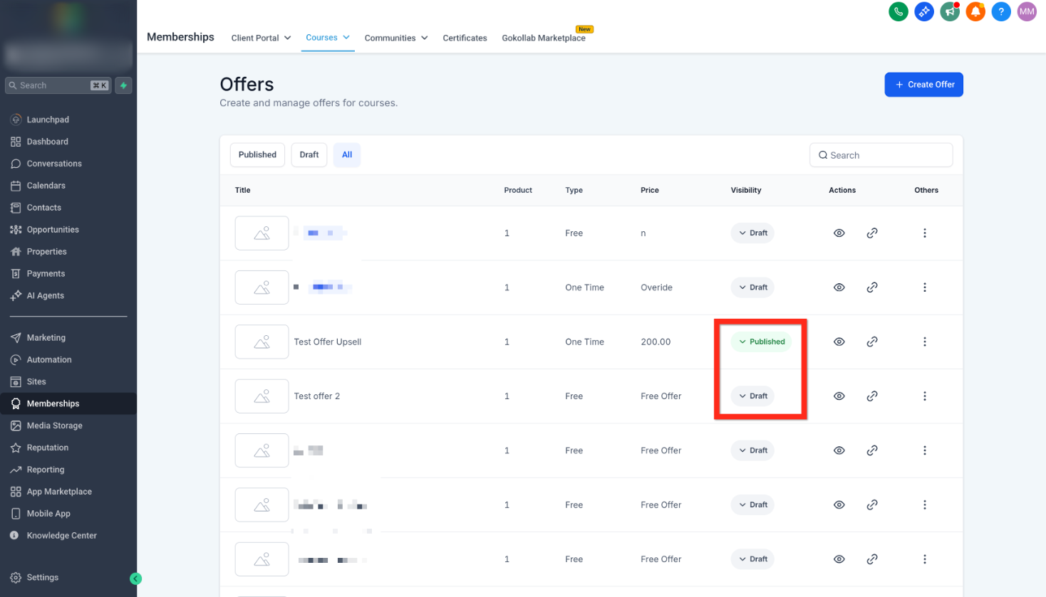 - Navigate back to Memberships > Courses > Offers.