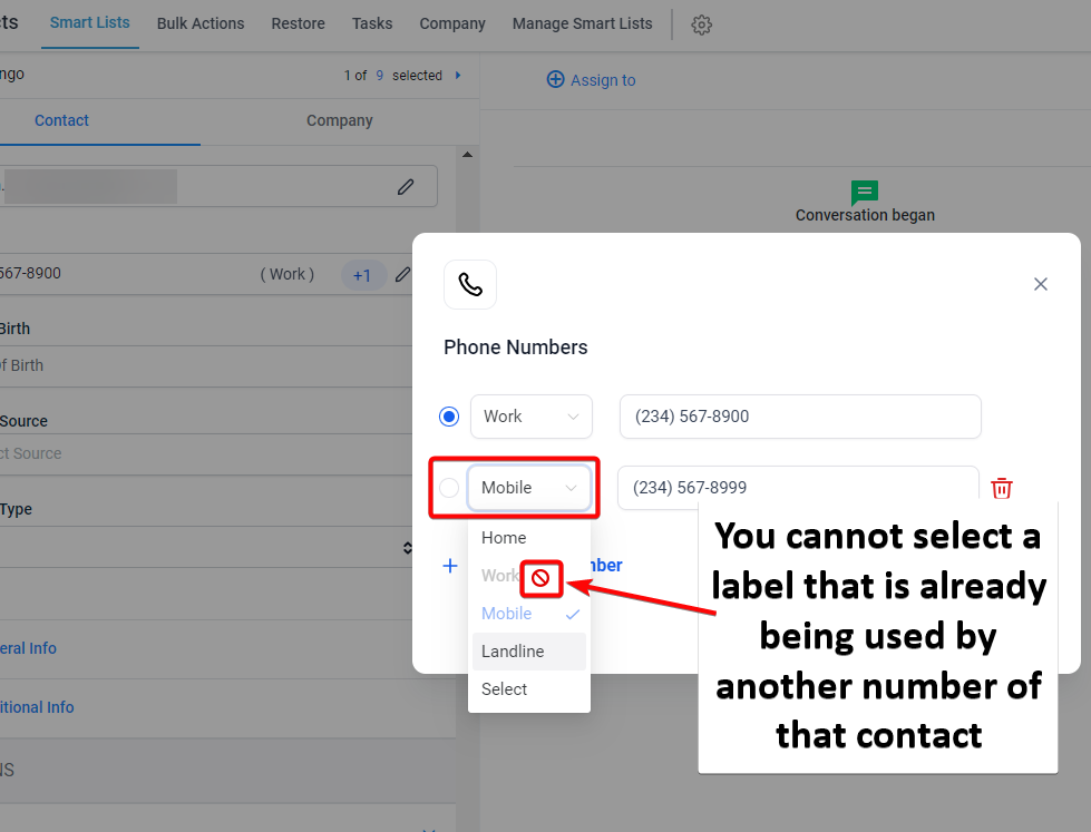 Phone Number Labels: To better categorize and differentiate the contact's phone numbers, users can add labels to each phone number. Current labels include Home, Landline, Mobile, and Work. Each label can be selected only once for a contact.