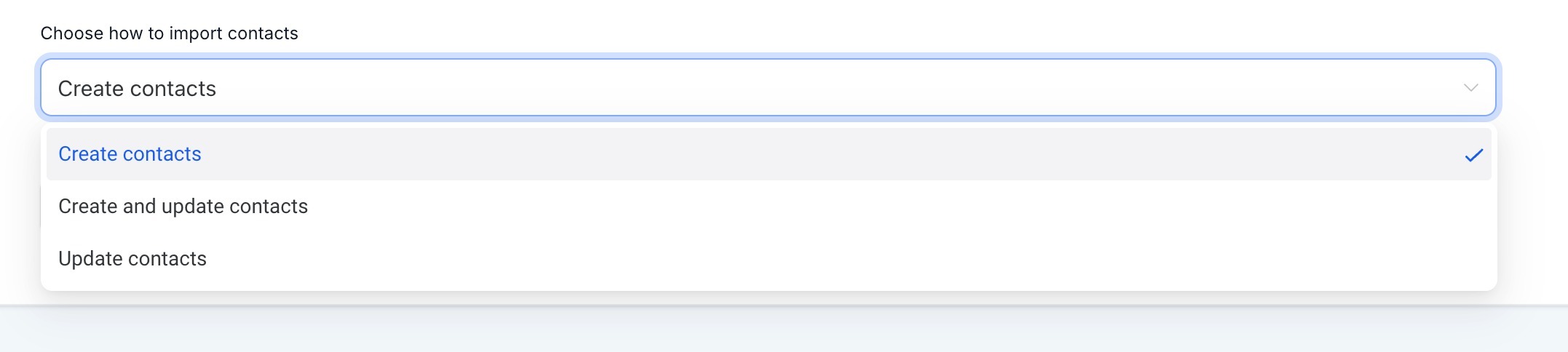 - Upload the file for importing and then click on "Choose how to import contacts" to decide whether you want to create, update or do both.
