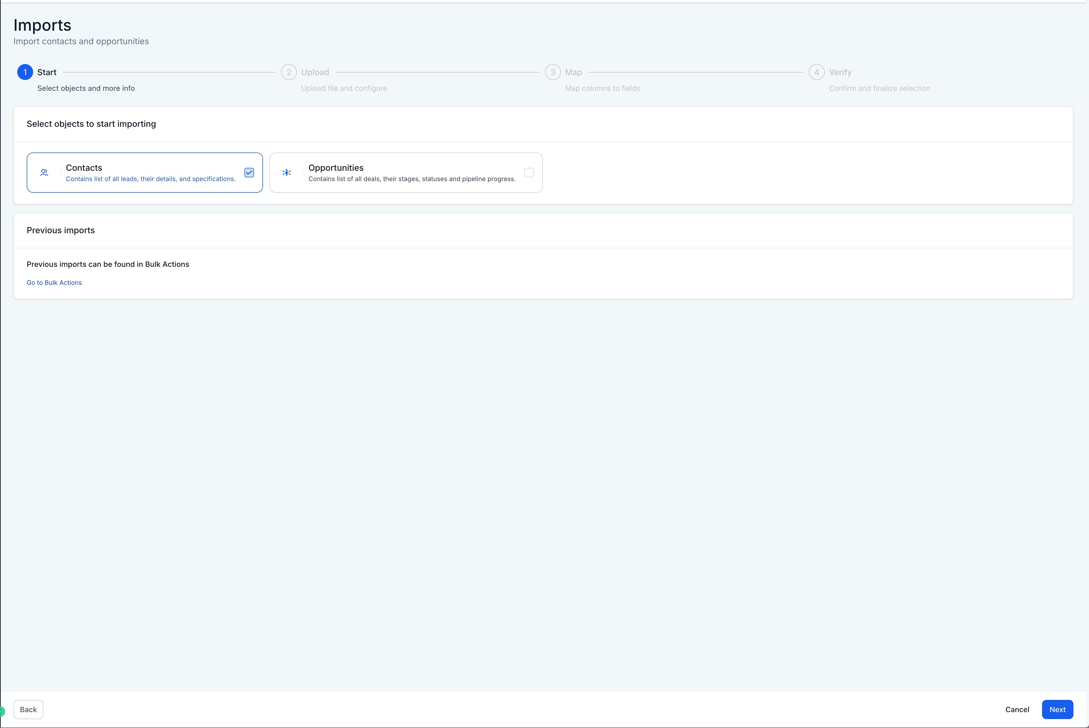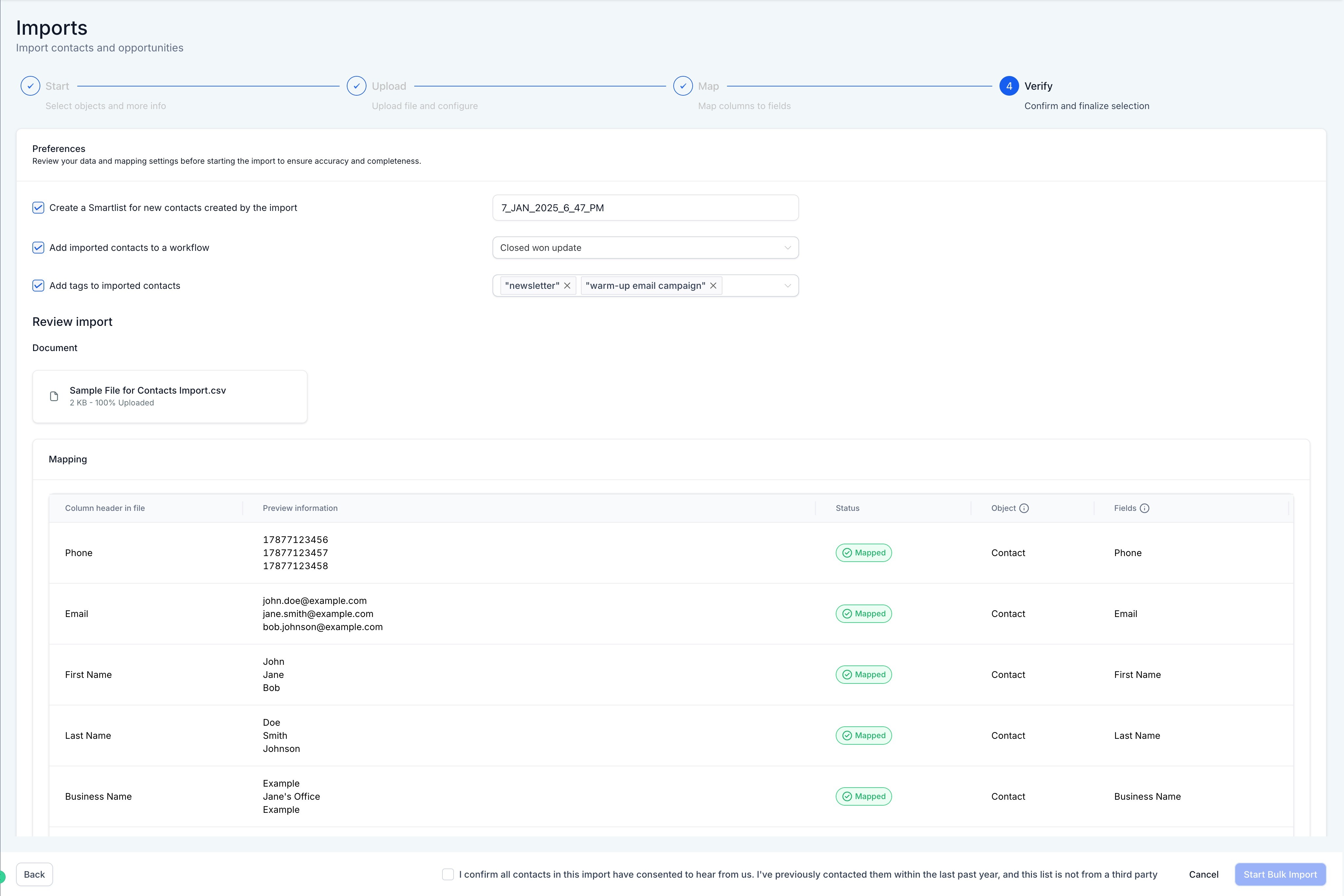 - At least one of the following fields is mandatory for creating a new contact: Name, Phone, or Email. Ensure these fields are included in your CSV and mapped correctly during the import process.