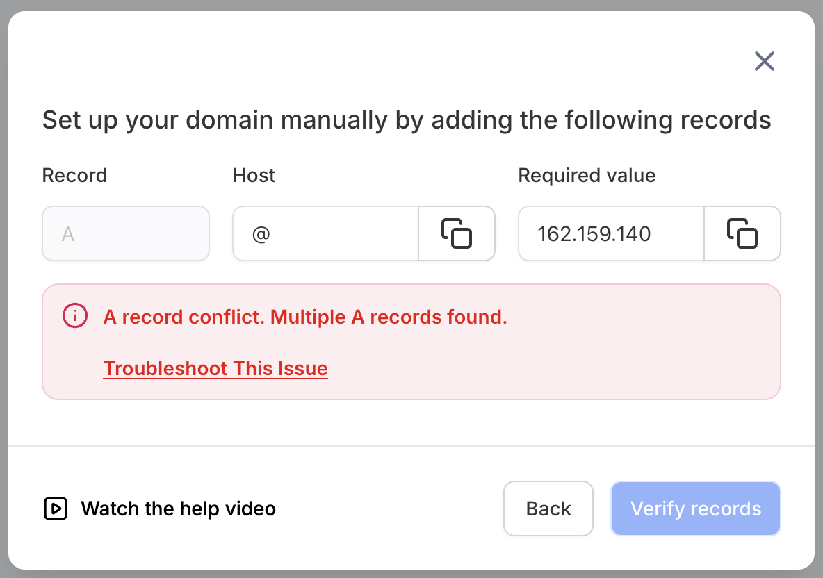 This guide will help you resolve common errors when connecting your domain to your platform. Follow the steps below to troubleshoot issues related to DNS records and domain conflicts.