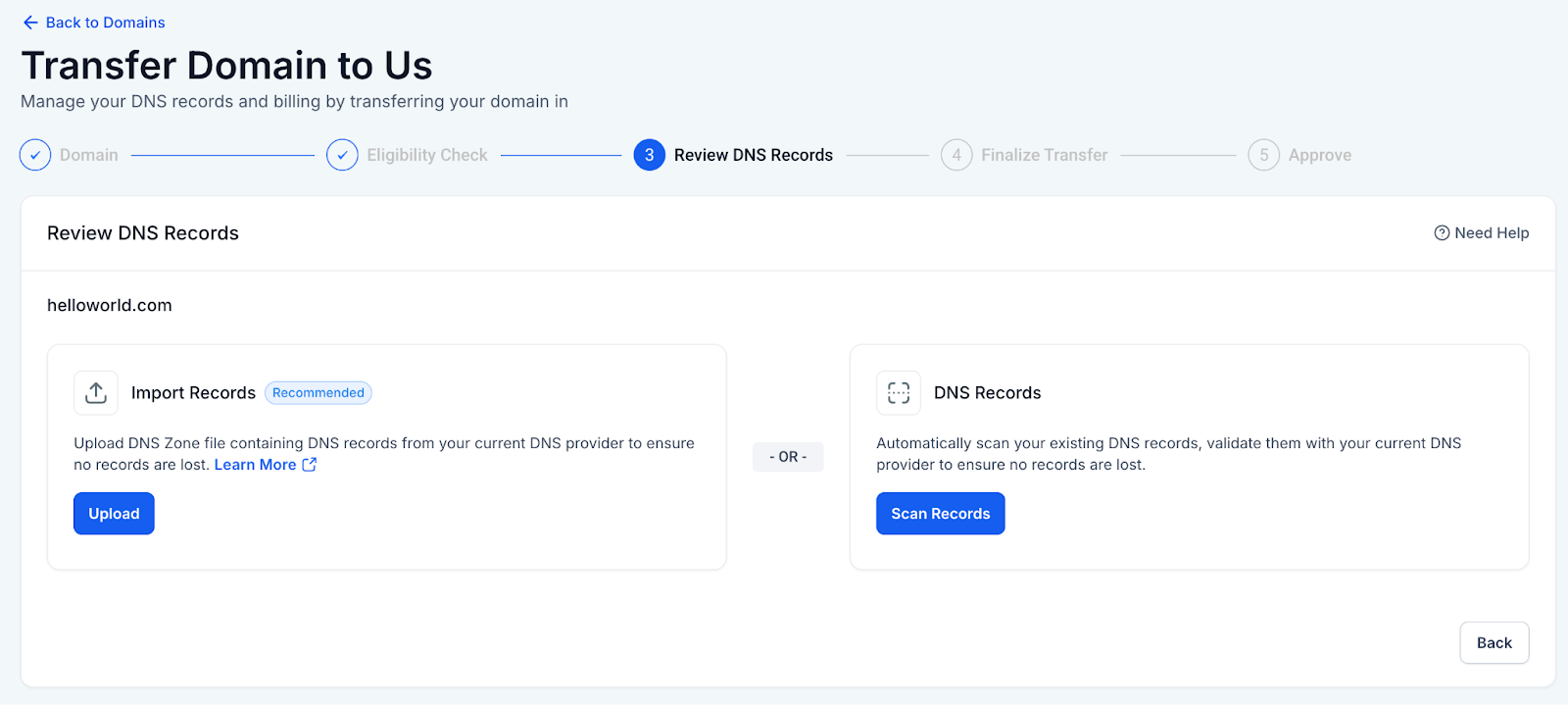 Once a domain has passed the Eligibility Check, the next step is to review its DNS records. In this step, users have the option to either