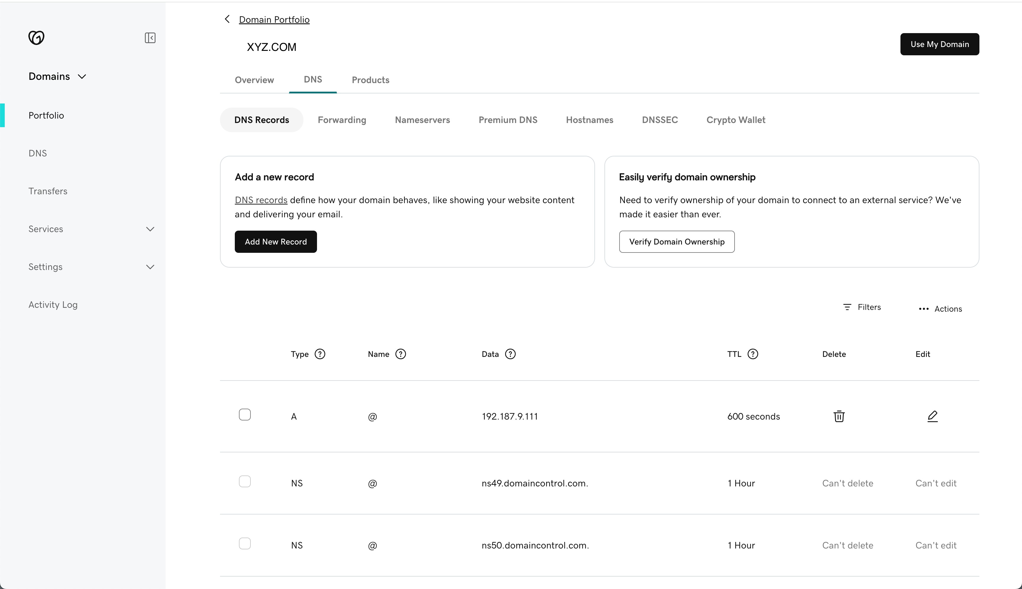 Once records are retrieved, you can now review your DNS records. In the DNS table shown you can: