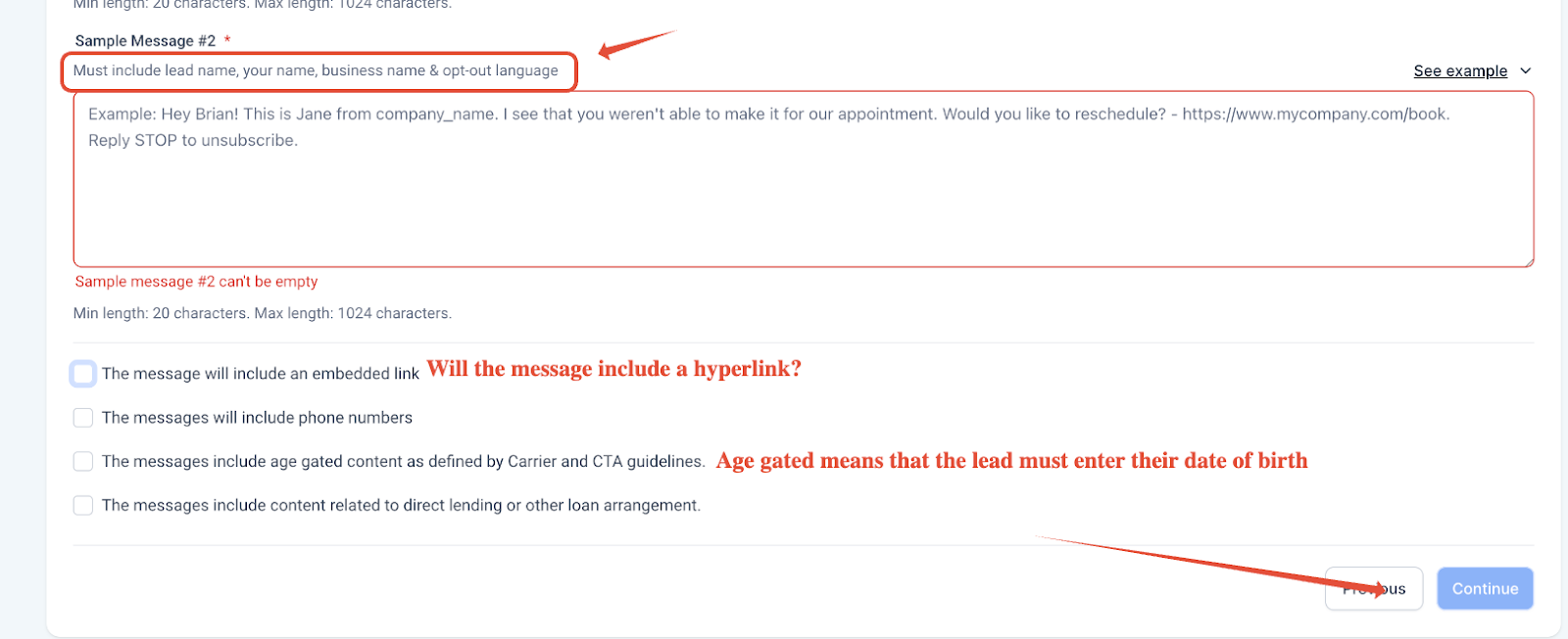 - Sample Message #1 & #2 refers to the sample messages you provide as part of your application for A2P10DLC campaign submission. These examples demonstrate the kind of SMS content you intend to send to your audience. The goal is to give carriers a clear idea of your messaging purpose, format, and compliance with regulations.