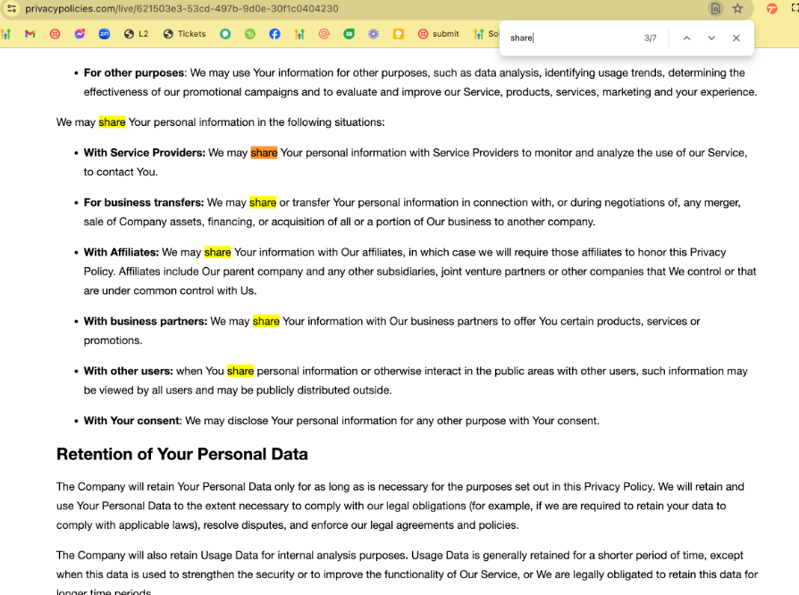 - Find Keywords: Look for words like share, disclose, sell, affiliate, and third-party.