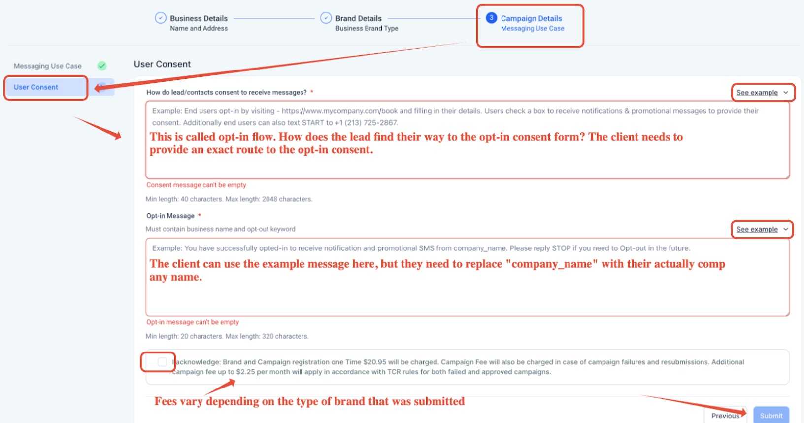 - e.g. End users opt in through an appointment form on the website: https://www.abccompany.com/appointment, Users check a box with optional consent language to receive messages from us to provide their consent at the end of the appointment form: https://storage.googleapis.com/msgsndr/RNTEDRA9ap9xSh2MyTYS/media/669825fa23e0faf564cdb24f.png