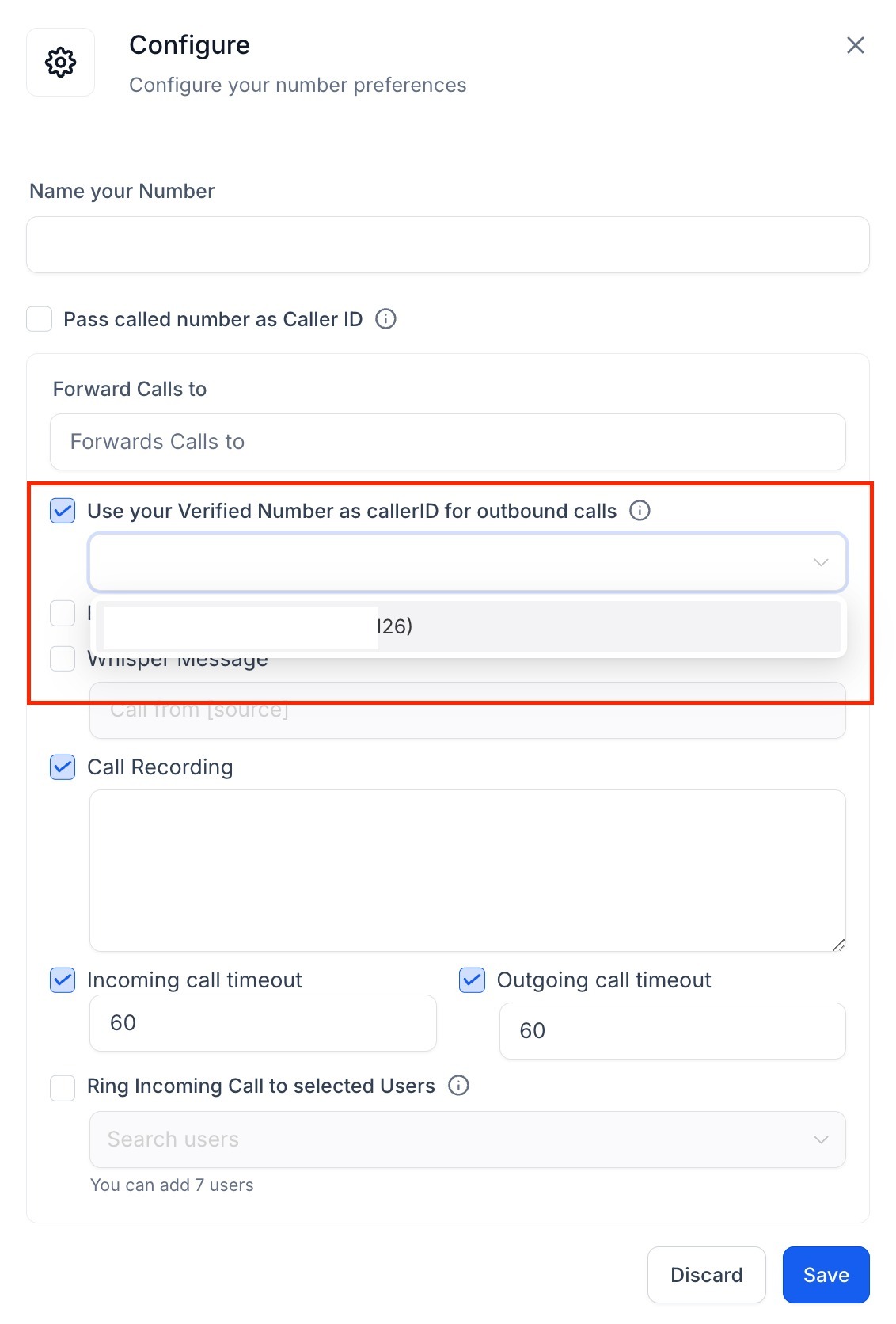 - Select Use your Verified Number as callerID for outbound calls option and choose the verified caller number and save it.