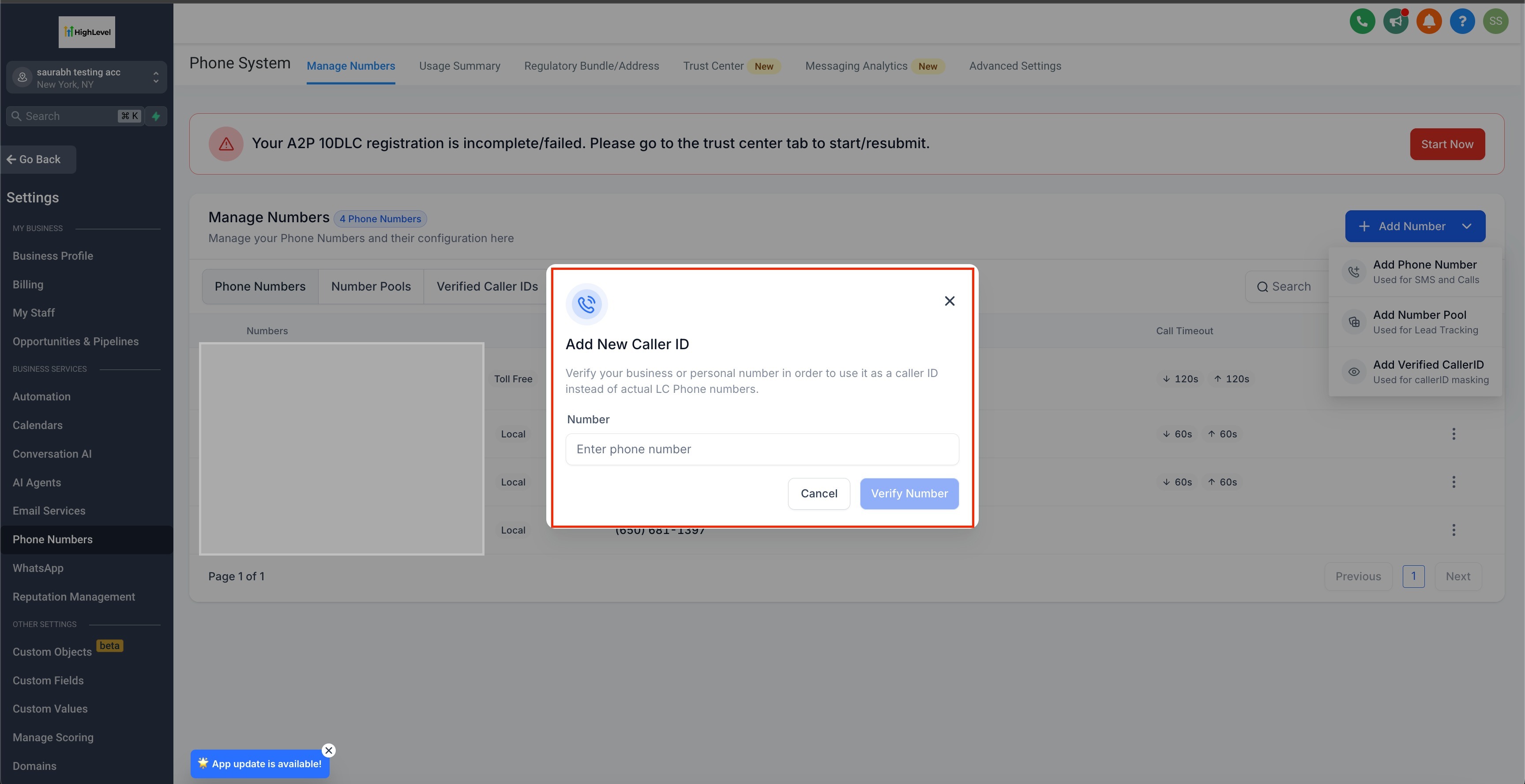 Step 6: Select the LC Phone Number under Phone Number Tab for which you want to use your phone number as caller ID.