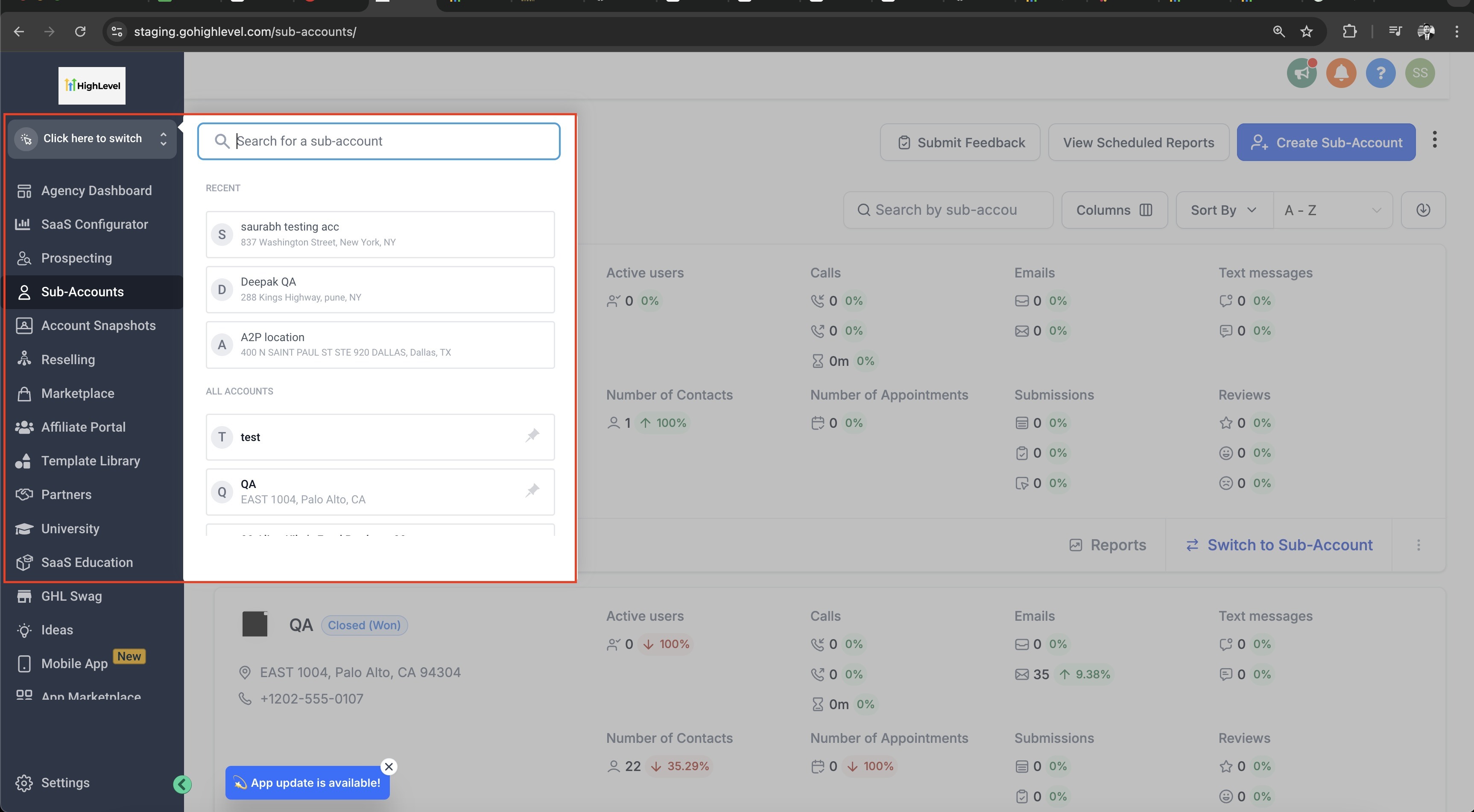 - Click on the Click here to switch option and search for the sub-account where you want to set up verified caller ID Then, click on the sub-account.