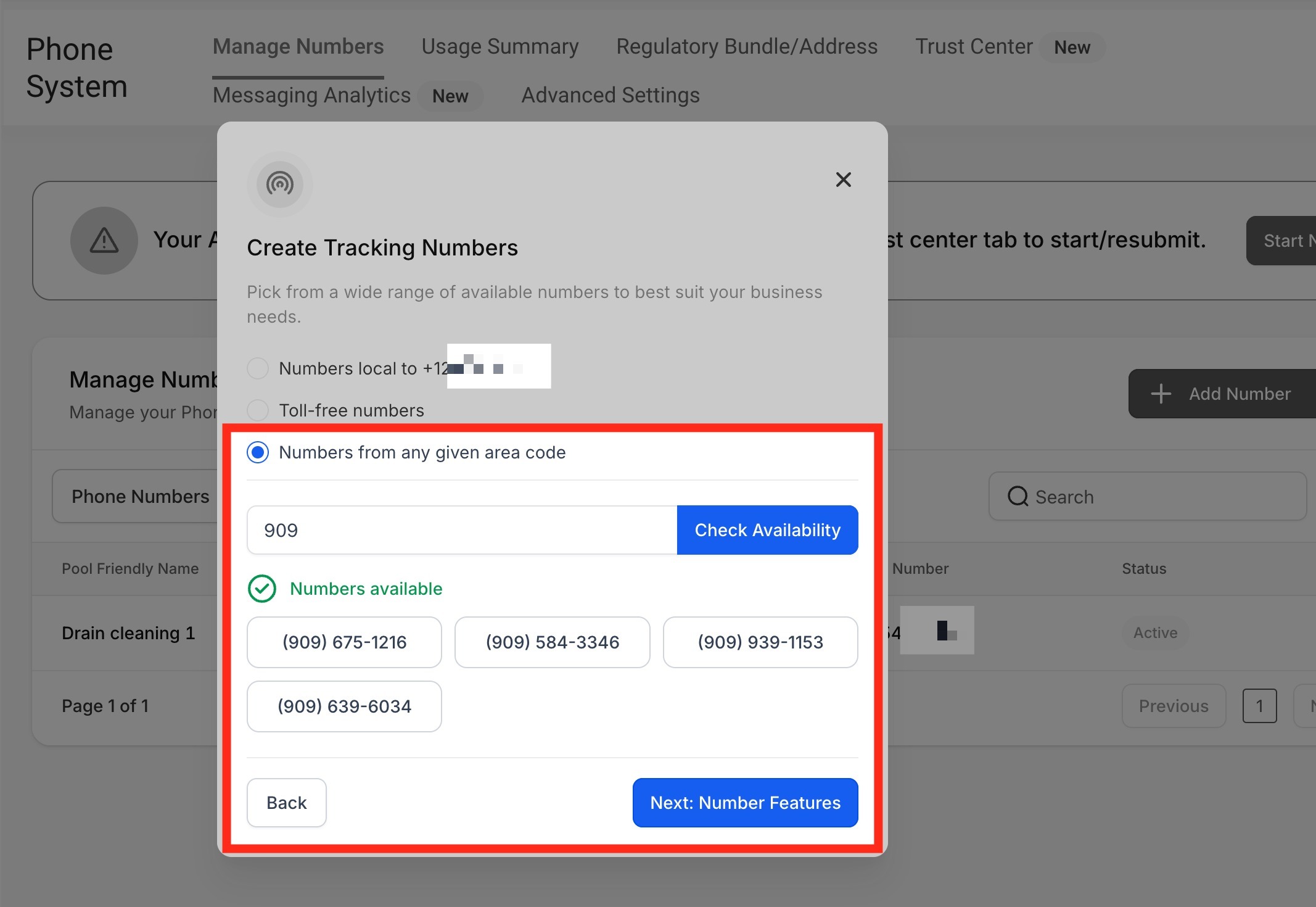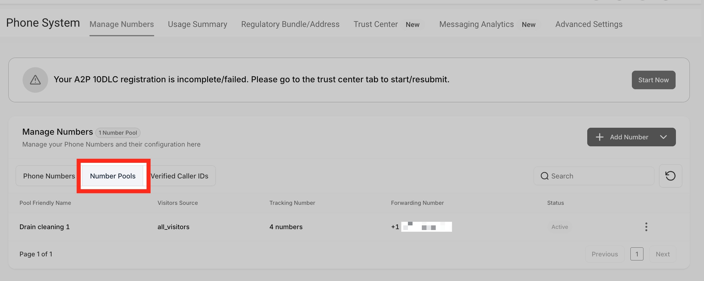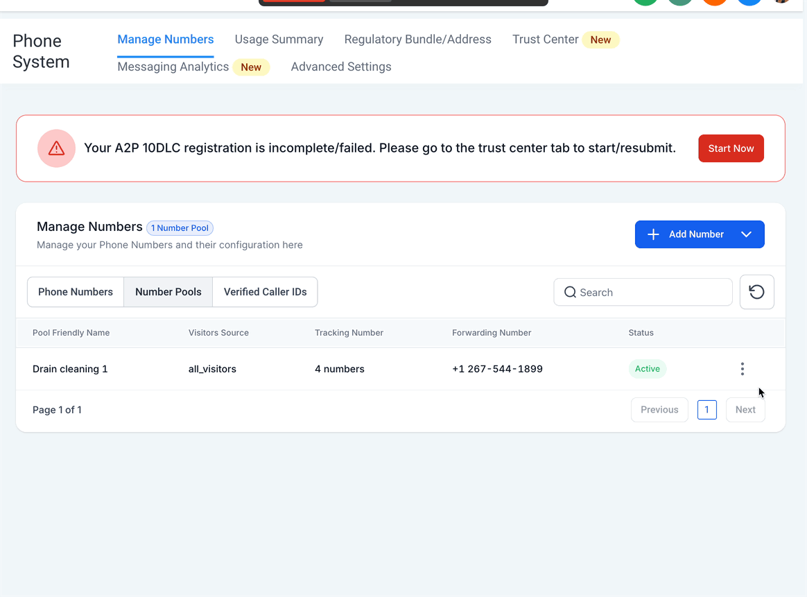 Click "Add Number Pool." You can find it under the "+ Add Number" dropdown menu located at the right side of the page.