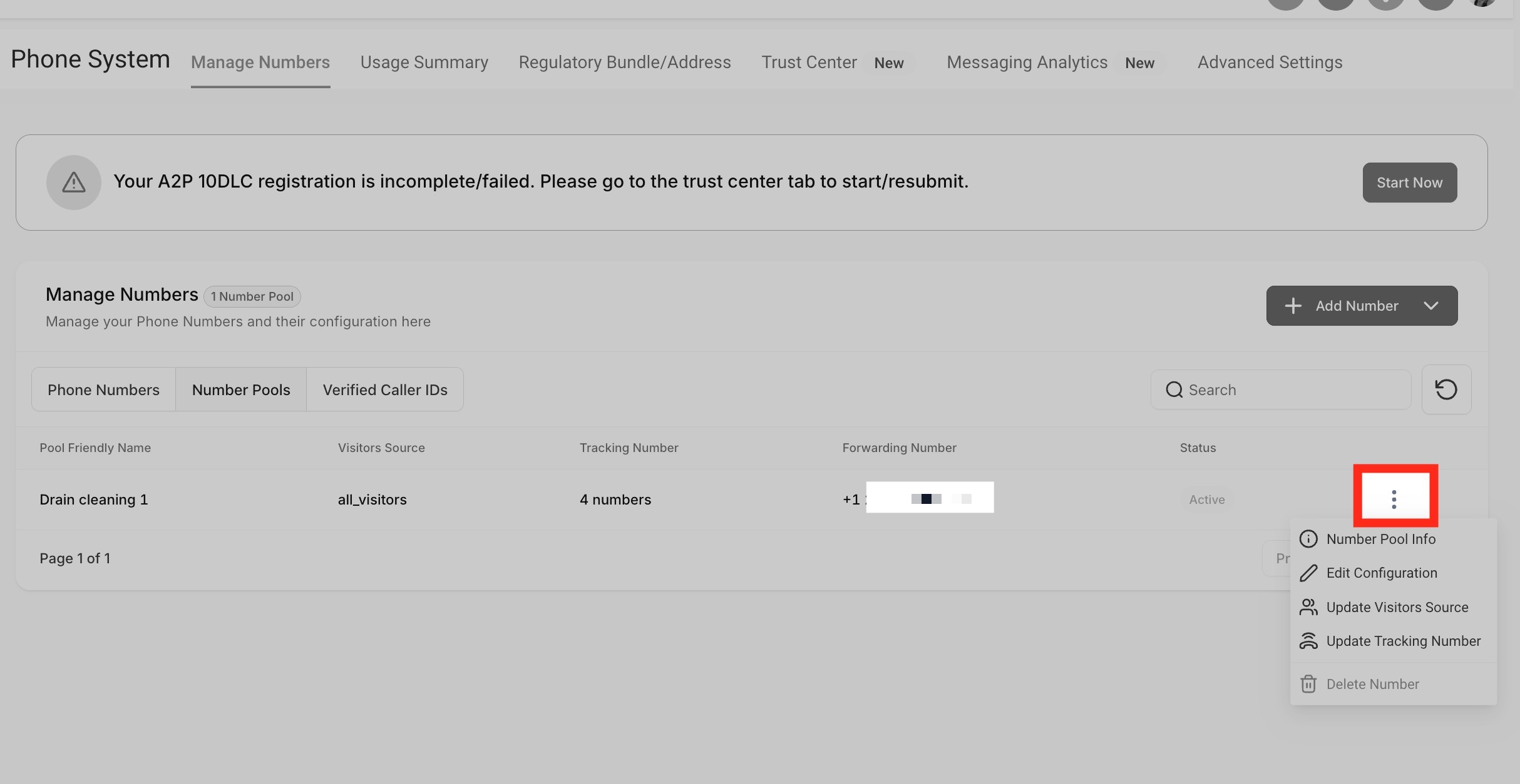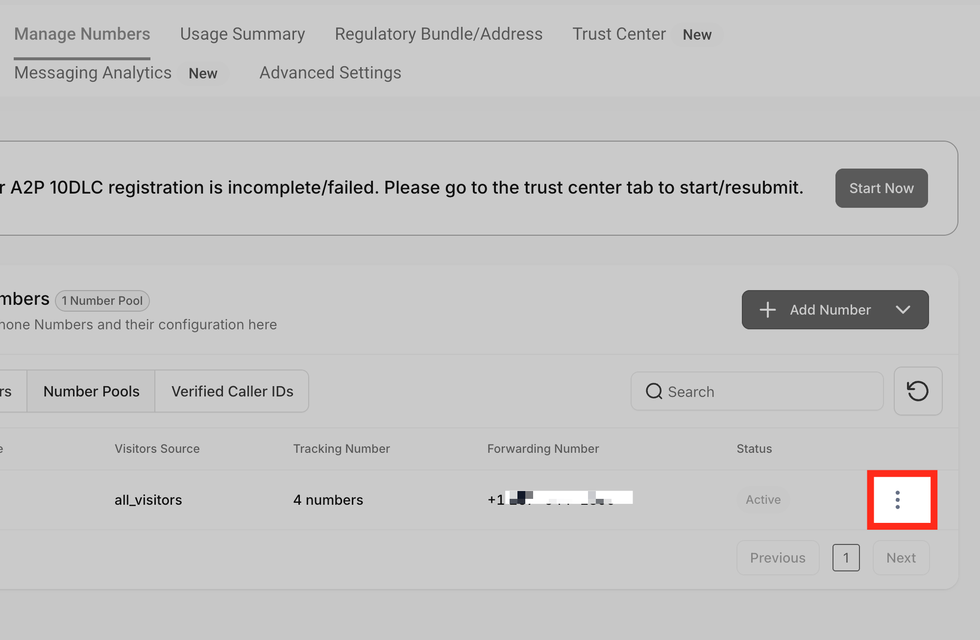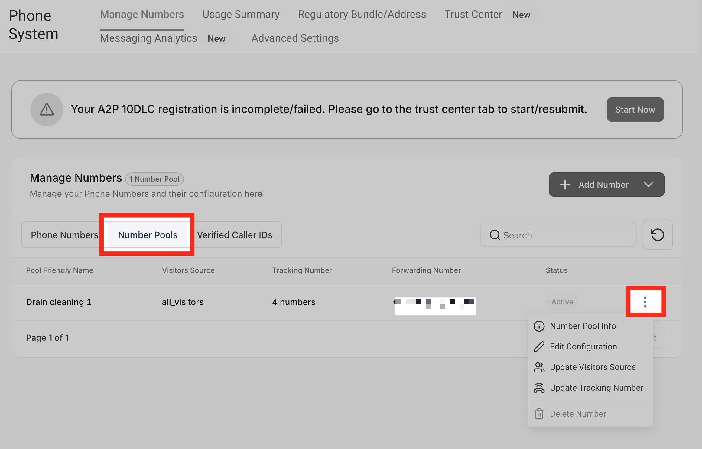Go back to our number pool setup. Hover over the number pool you just created and Click the three dots menu.