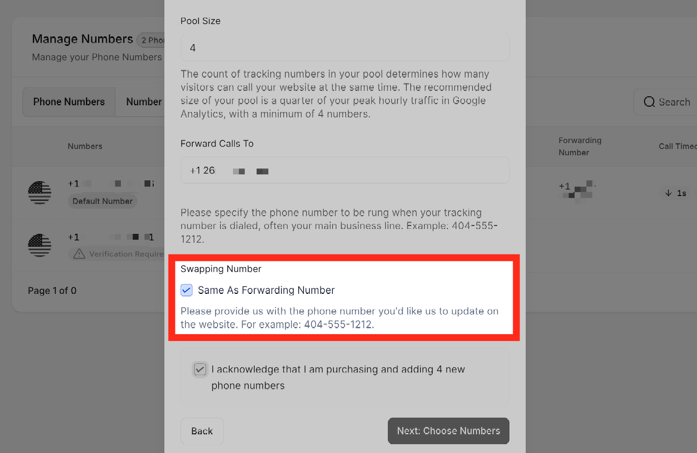 By checking this box, you acknowledge that you are purchasing 4 new phone number to add to your number pool.