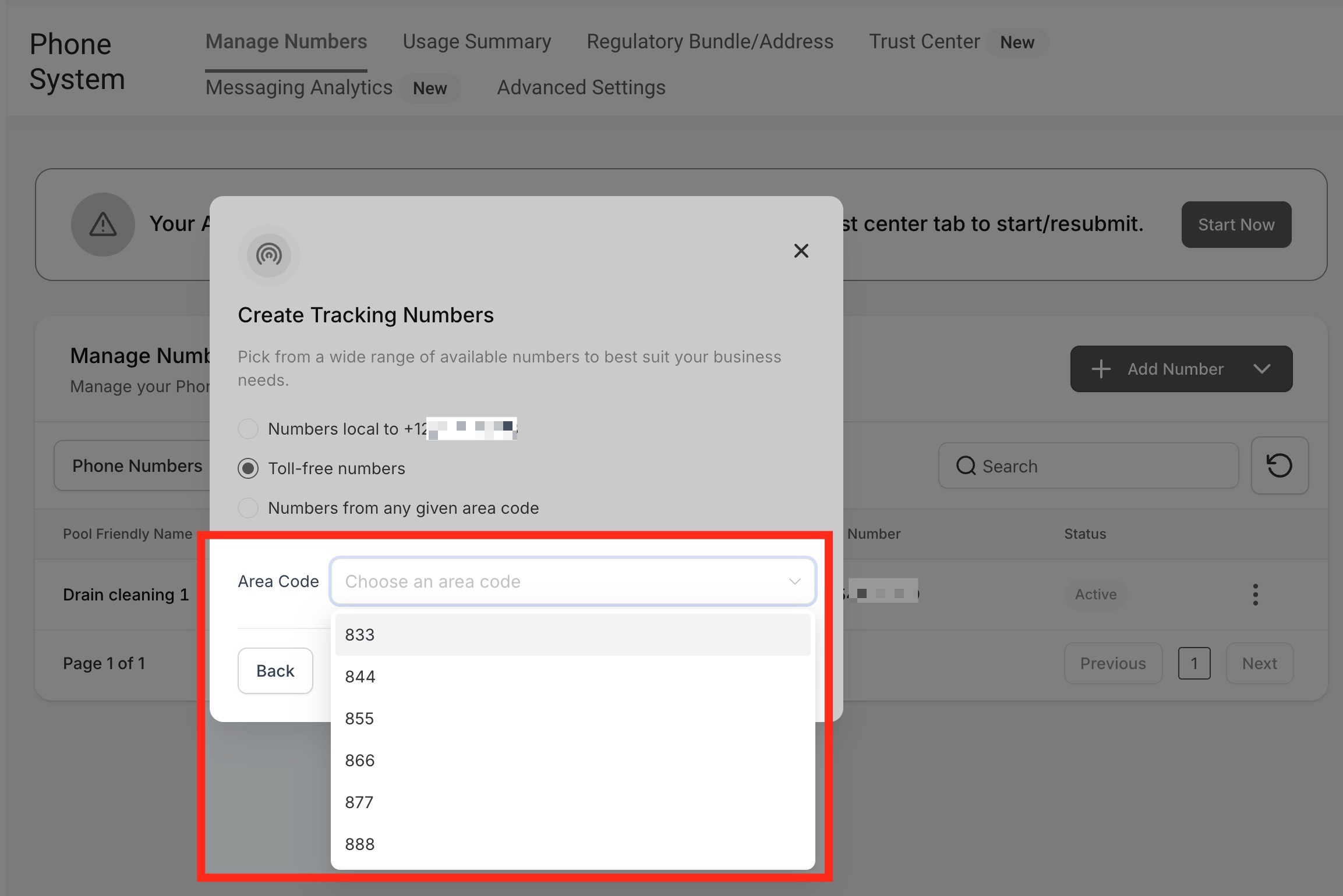 To se the available toll-free numbers, Choose the area code from the dropdown menu.