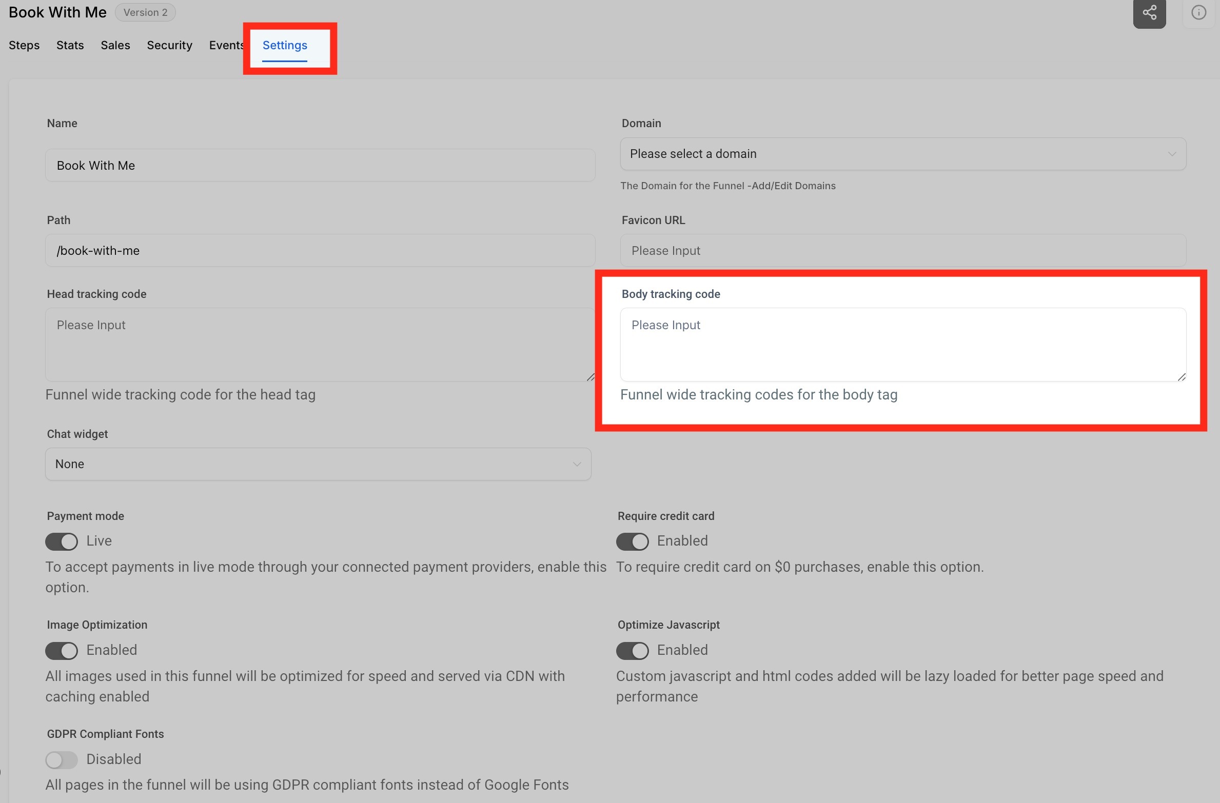 Once you are inside the funnel/website, click "Settings" tab. Now Paste the copied Normal snippet at the bottom of your Body Tracking code field.