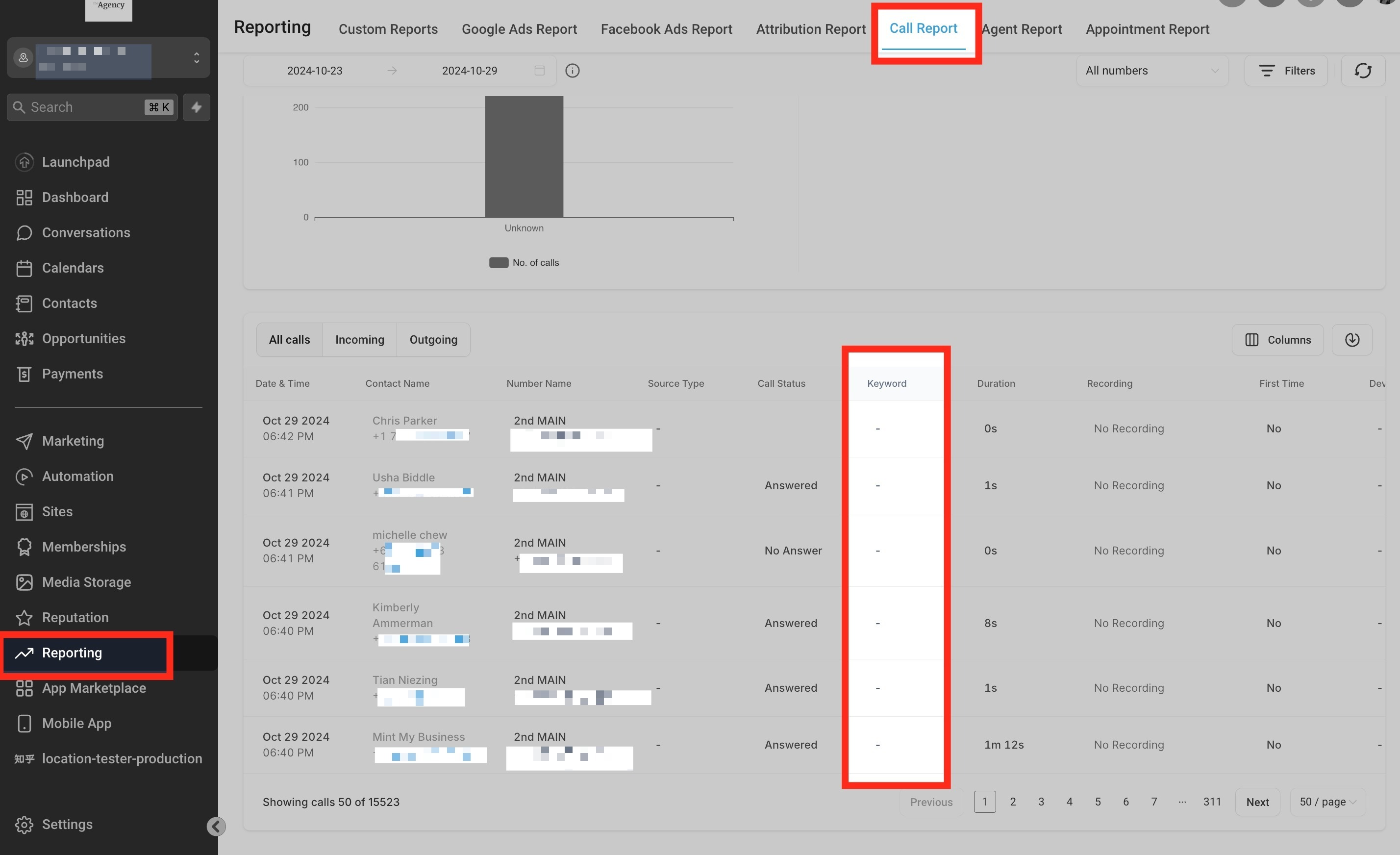 Once the number pool is set up and running, you can view the Keyword column under Reporting in the "Call Report."
