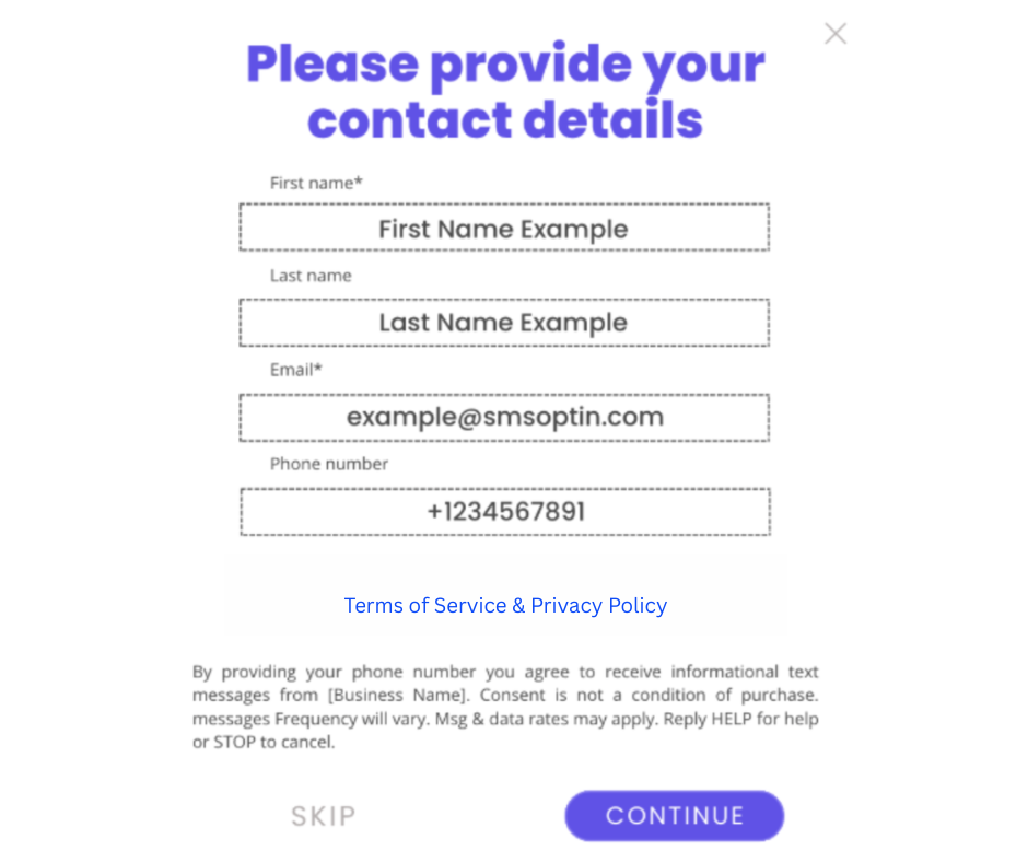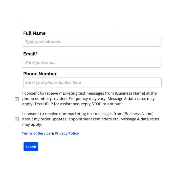 This form must include an unmarked checkbox, clear consent language, and opt-out instructions (e.g., “Text STOP to opt out.”)