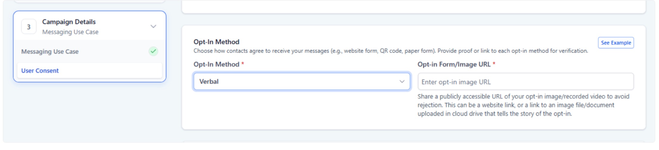Note: 1. If verbal opt-in is selected, please provide a publicly accessible Google Doc or PDF link that includes the exact verbal opt-in script used in opt-in form/Image url field, along with a brief explanation of when and how the script is presented to users to obtain consent.