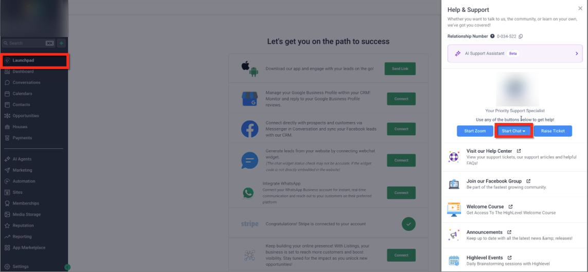 To reach support, click the Help (?) button in the upper right corner of the screen then use the Start Chat dropdown to select Agent Chat.