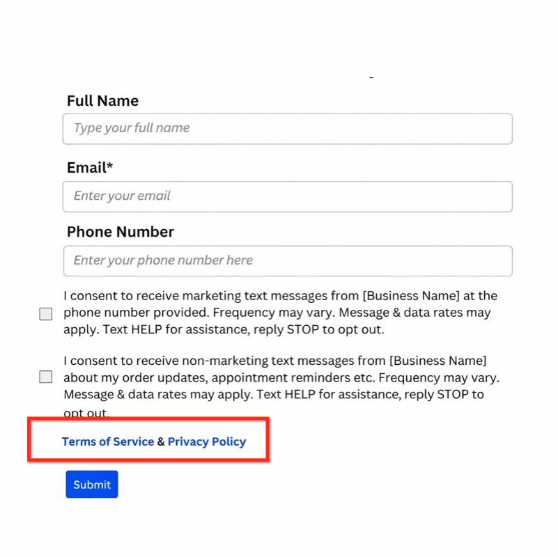 A visible link to your Terms & Conditions must also be included in the footer. These terms should outline messaging expectations, opt-out instructions, and user responsibilities.