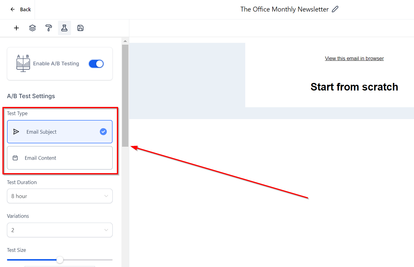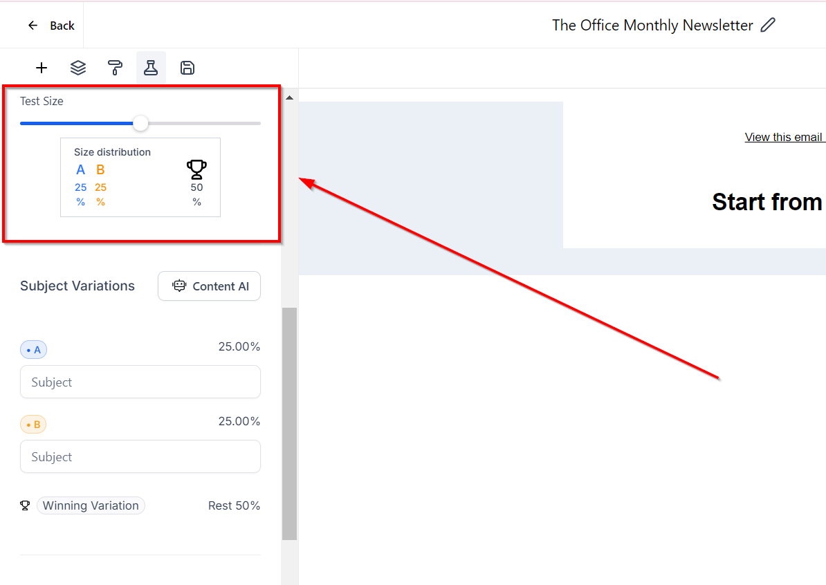 The number of variations in the email campaign will be based on the strategy that you are following. To set the Test Size, use the slider to decide what percentage of contacts will receive different variations. You can also set the slider to variations to 50%.