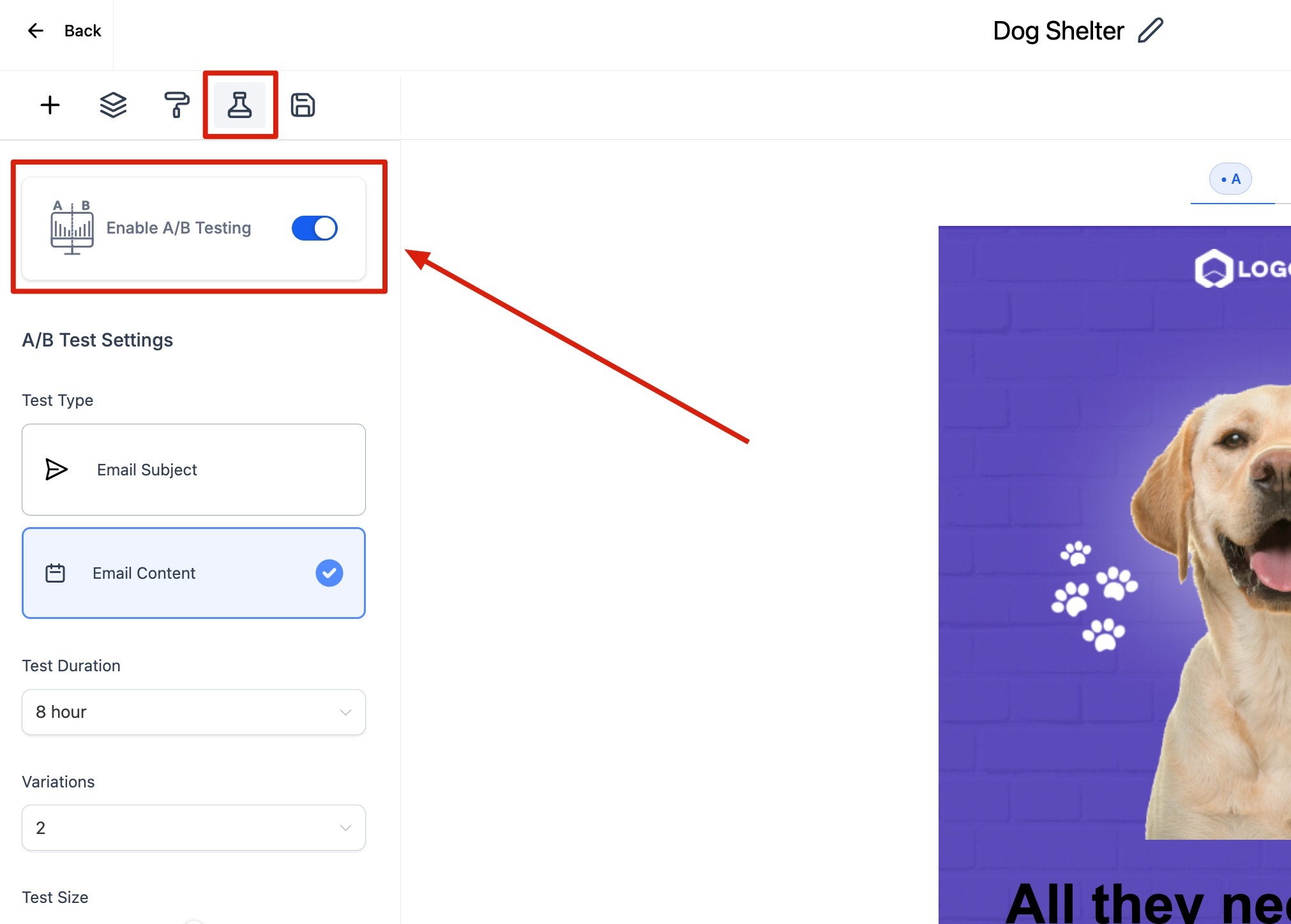 Step 1: Go to Marketing > Emails > Select "Campaign" from the dropdown. After creating a new Email Campaign, there is an option to enable "A/B Testing."