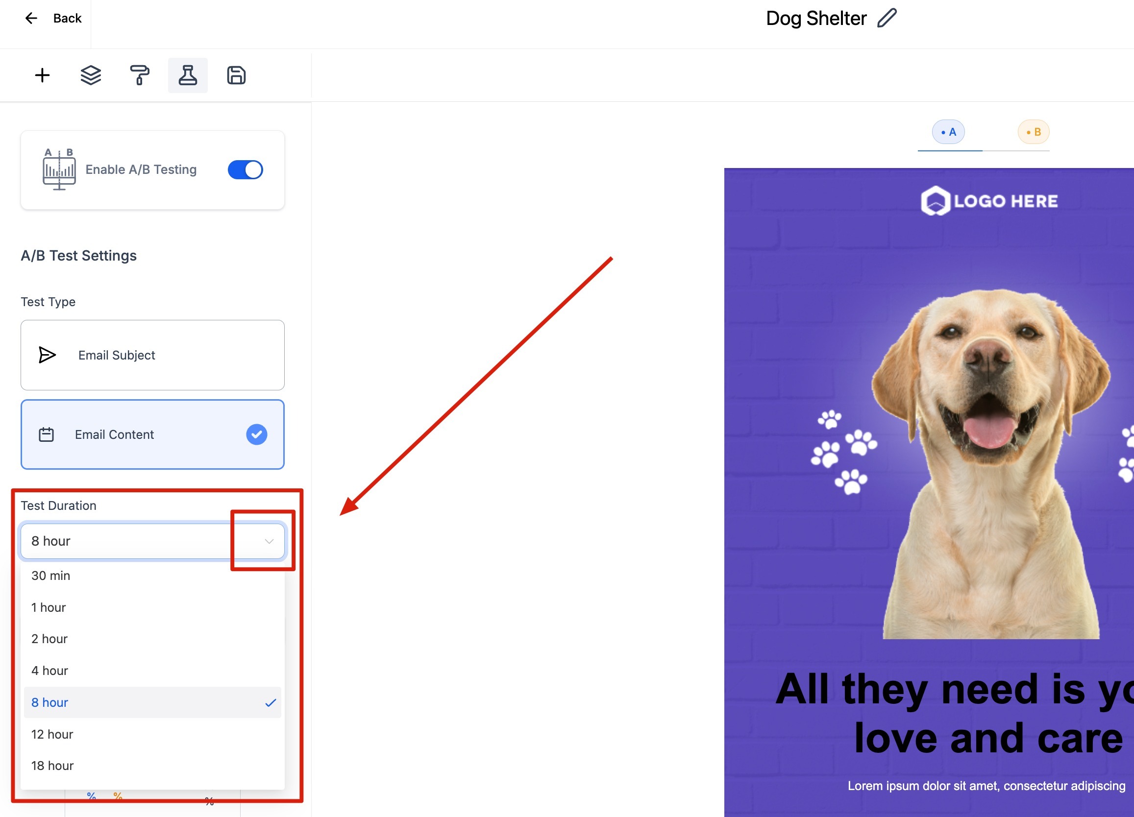 Step 2: Choose which you would like to split test: Email subject line or Email content.
