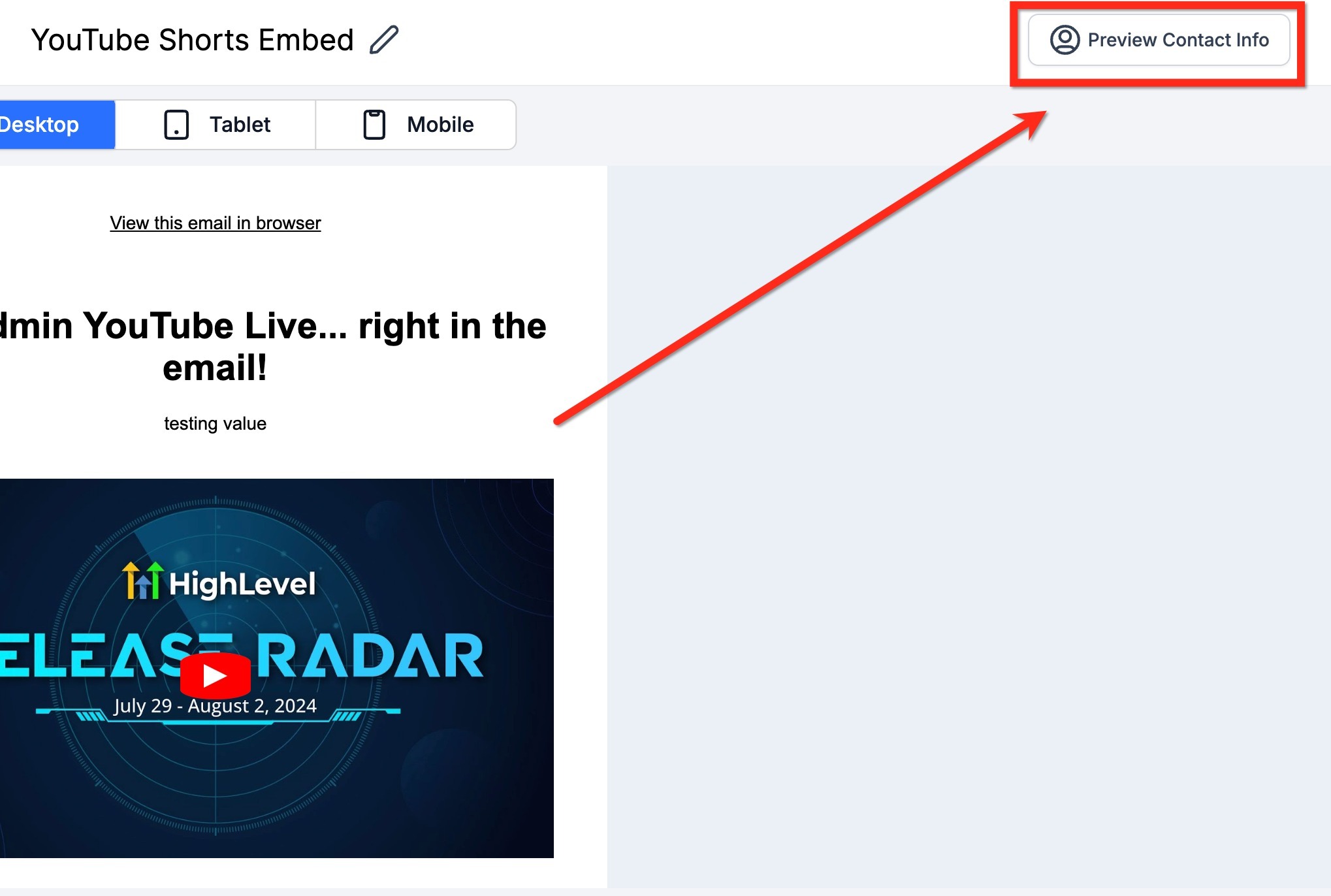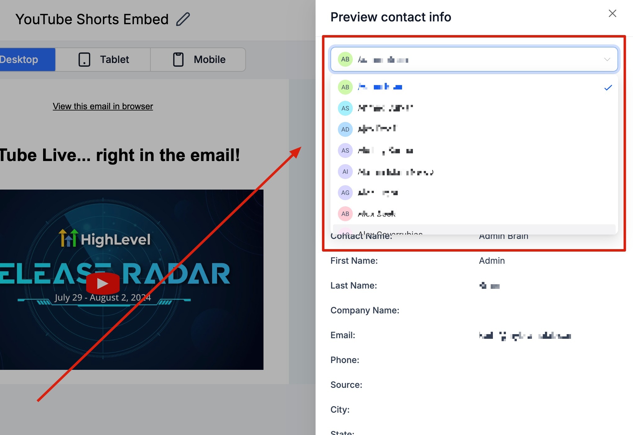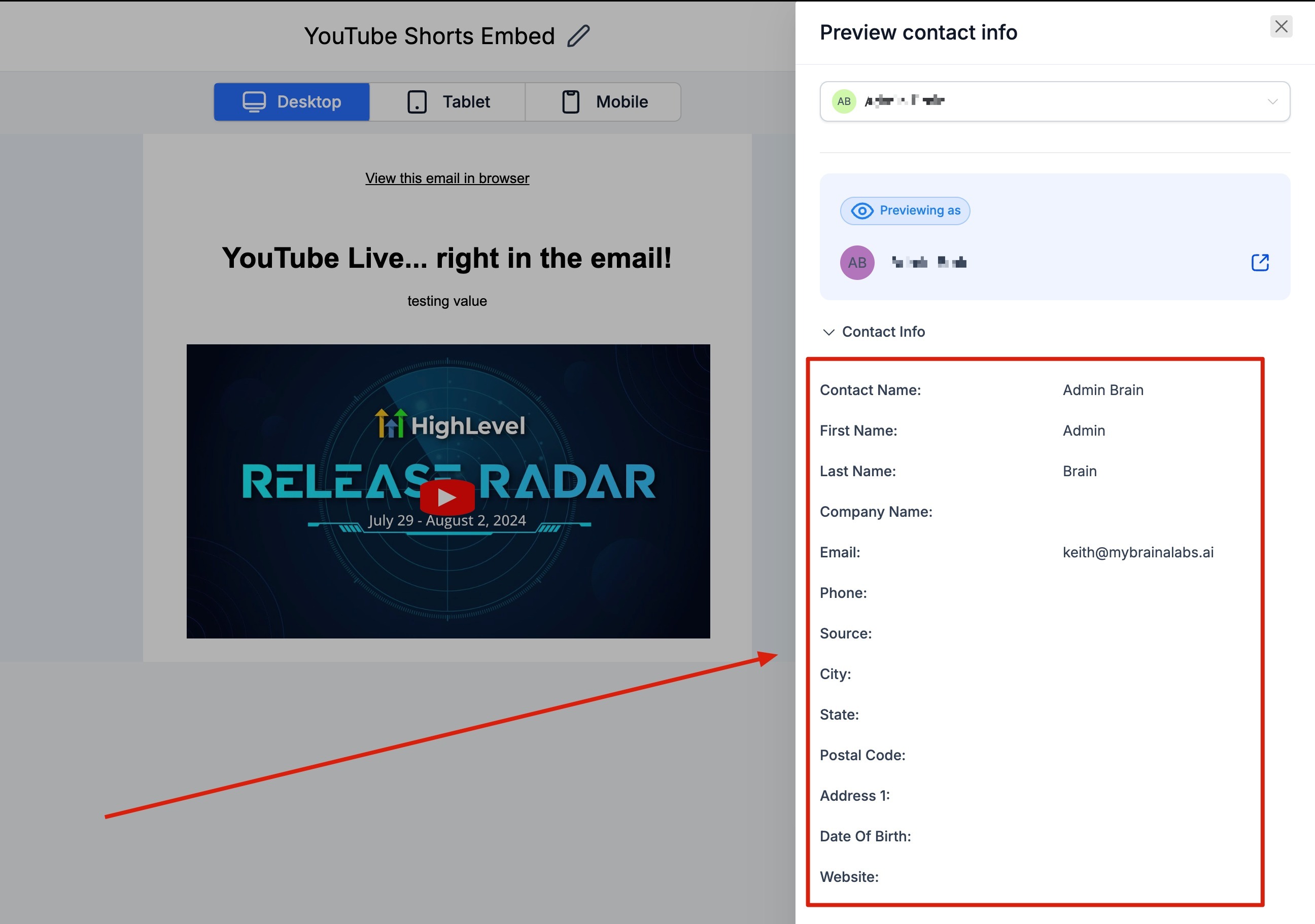 Step 6. You'll observe the contact's information and custom field data on the right panel, alongside the email preview on the left. This gives you a glimpse of how the selected contact would view the email.