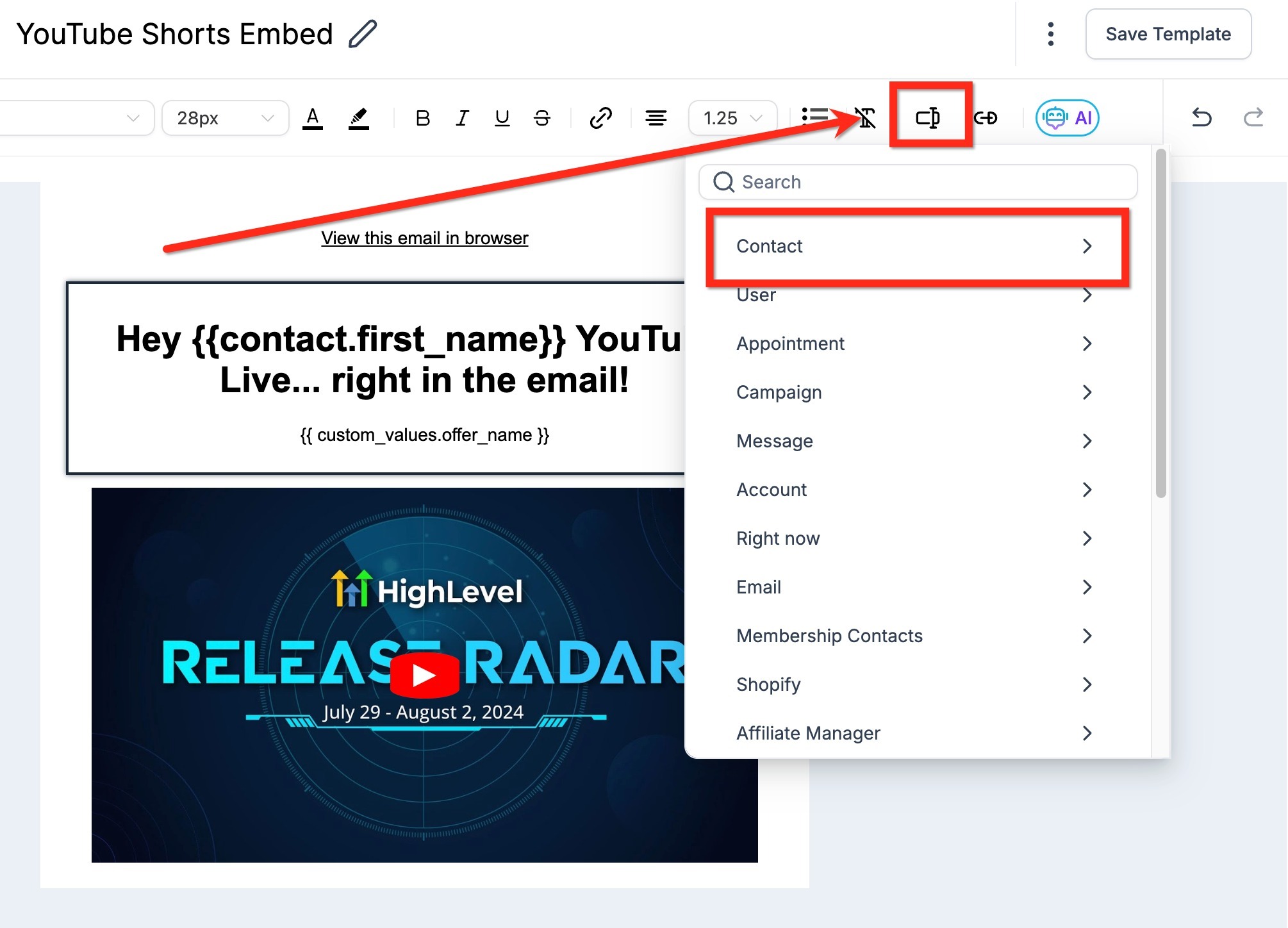 Step 5. By default, a contact's information is displayed in the email. To preview as a specific contact, simply search for the desired contact from the search bar.