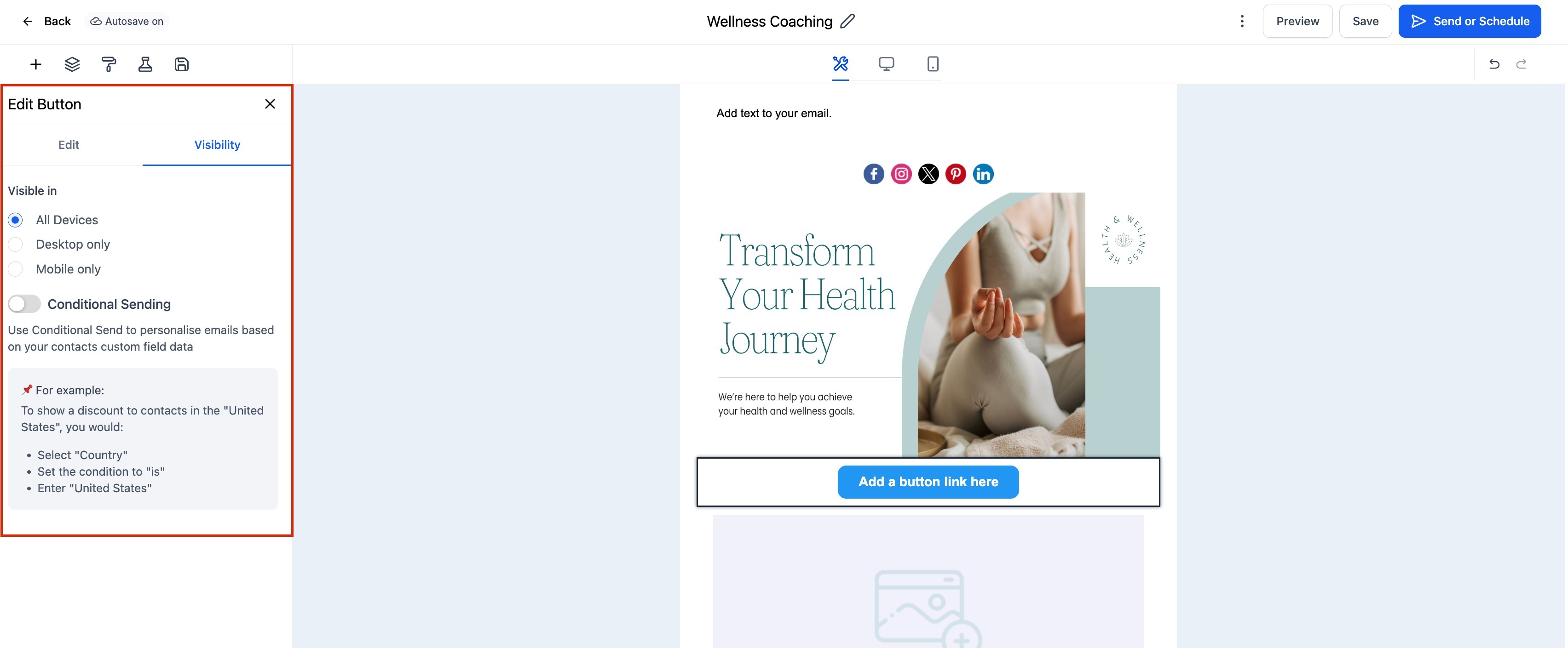 Preview your email in both desktop and mobile modes to ensure the button looks and functions correctly.